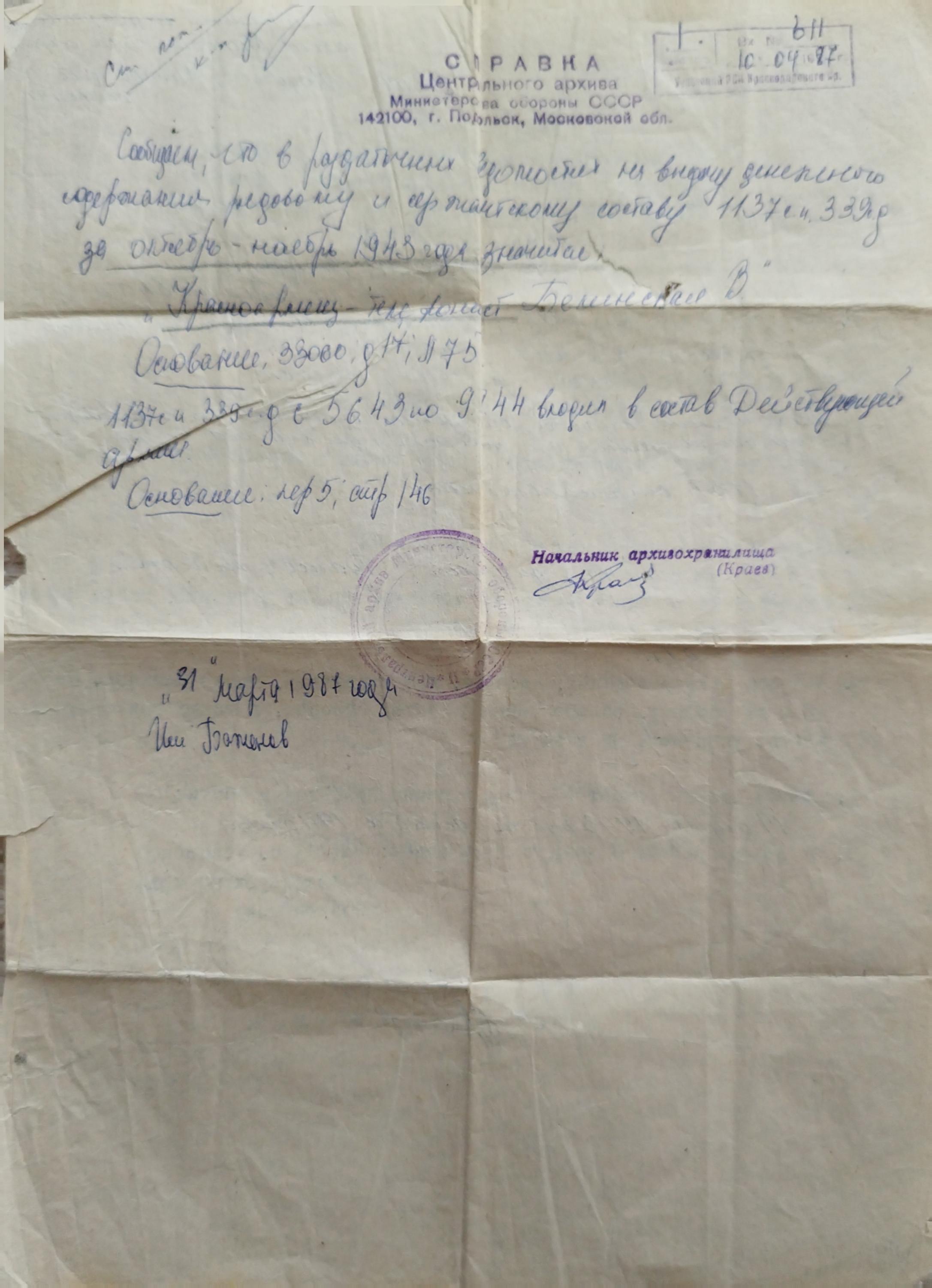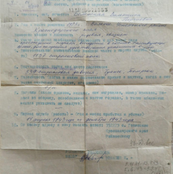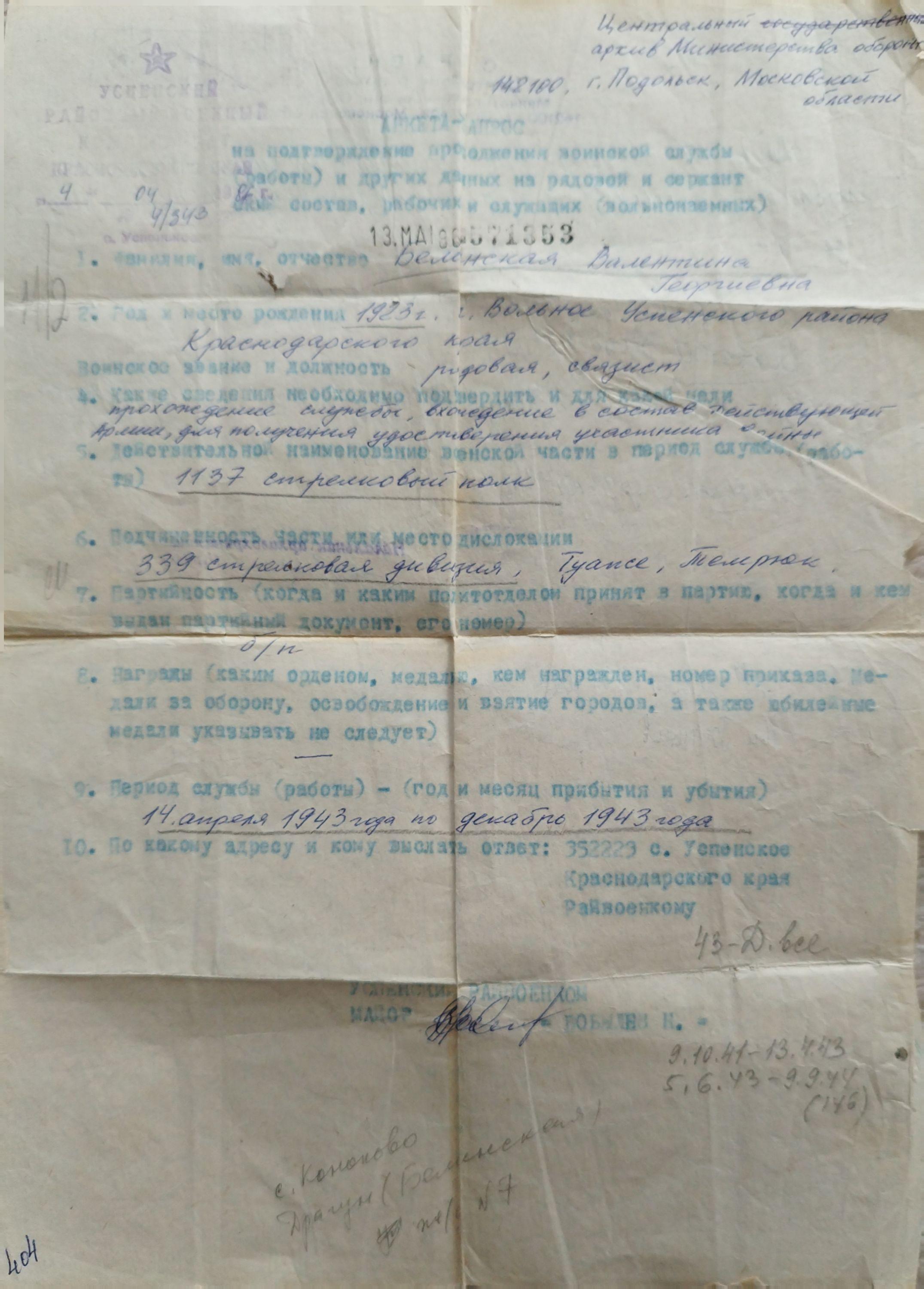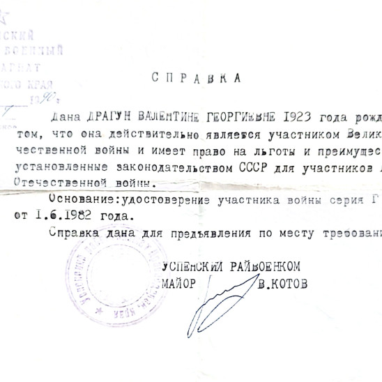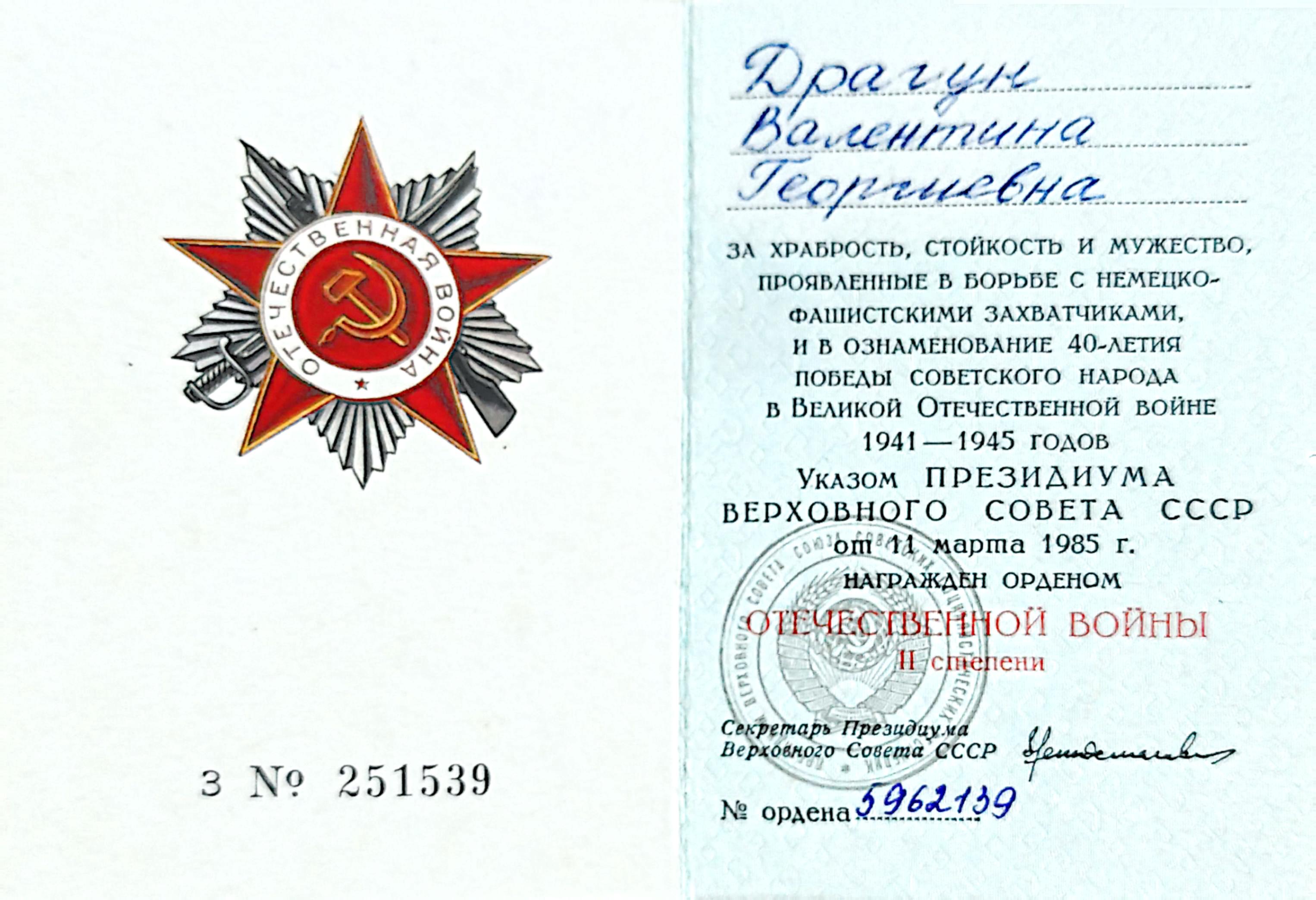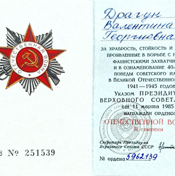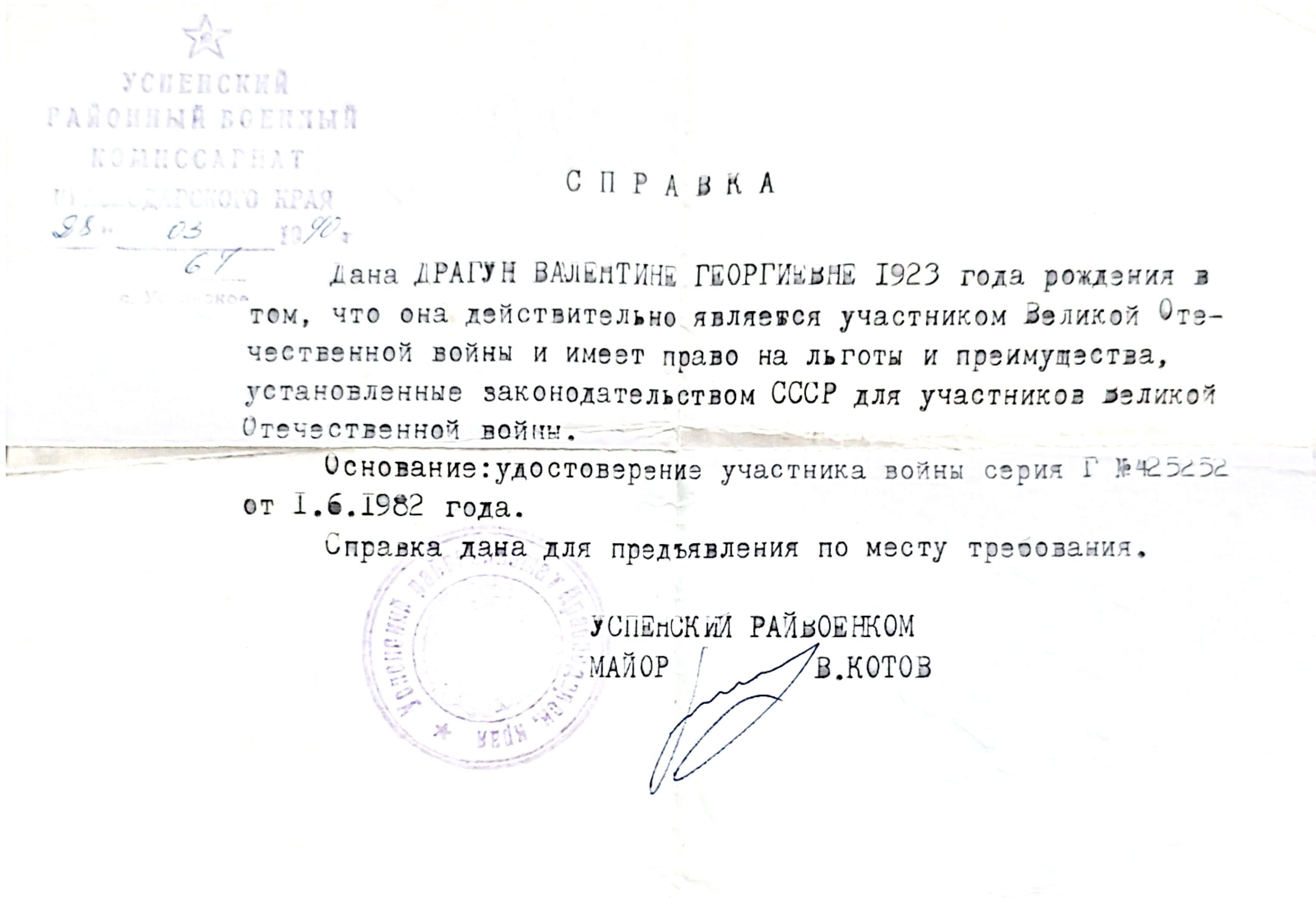Драгун (Белинская) Валентина Георгиевна Родилась 9 декабря 1923 года в с. Вольное Успенского района Краснодарского Края. В конце 30х годов переехала в г. Армавир вместе с родителями, братьями и сестрами. Школу окончила перед самой войной. Старшие братья и дядя ушли на фронт, а ей еще не было 18 лет, но она добилась, чтобы ее отправили в школу связи под Москву. Осенью 1941 года принимала участие в боях под Москвой, потом вместе с группой перебросили в Новочеркасск на формирование 339 стрелковой дивизии, служила в 1137 стрелковом полку связисткой. Полк участвовал в ожесточенных боях под Туапсе, Темрюком. В ходе наступательной операции на Таманском полуострове получила тяжелое ранение (декабрь 1943 года) и отправлена в госпиталь. После служила в 1м женском Сталинском авиаполку, освобождала в составе других подразделений Украину, Молдавию, Румынию, Венгрию. Второе ранение получила в Румынии под Бухарестом, но в госпиталь не поехала. Там же познакомилась со своим первым мужем - Евдокимовым Борисом Иосифовичем (пропал без вести на войне). Участвовала в боях под озером Балатон и Будапештом в Венгрии. После взятия Будапешта получила сильную контузию и вернулась домой. 23 июня 1945 года родилась старшая дочь - Вера. Войну закончила в звании Старший Сержант. После войны работала в военном госпитале в г. Армавире, потом вместе с мужем (Драгун Тарас Денисович) уехала на Сахалин, где 14 апреля 1958 года родилась младшая дочь - Людмила. Вернувшись приходилось работать на заводах и фабриках города. Долгое время проработала оператором на нефтеналивном предприятии станции Коноково Краснодарского Края. В связи с утерей документов в Армавирском военкомате, долгие годы поисков, подтверждающих ее боевое прошлое, в списках не значилась. И только 31 марта 1987 года пришла справка из Центрального архива МО СССР. 22 октября 1991 года после тяжелой болезни ее не стало.
