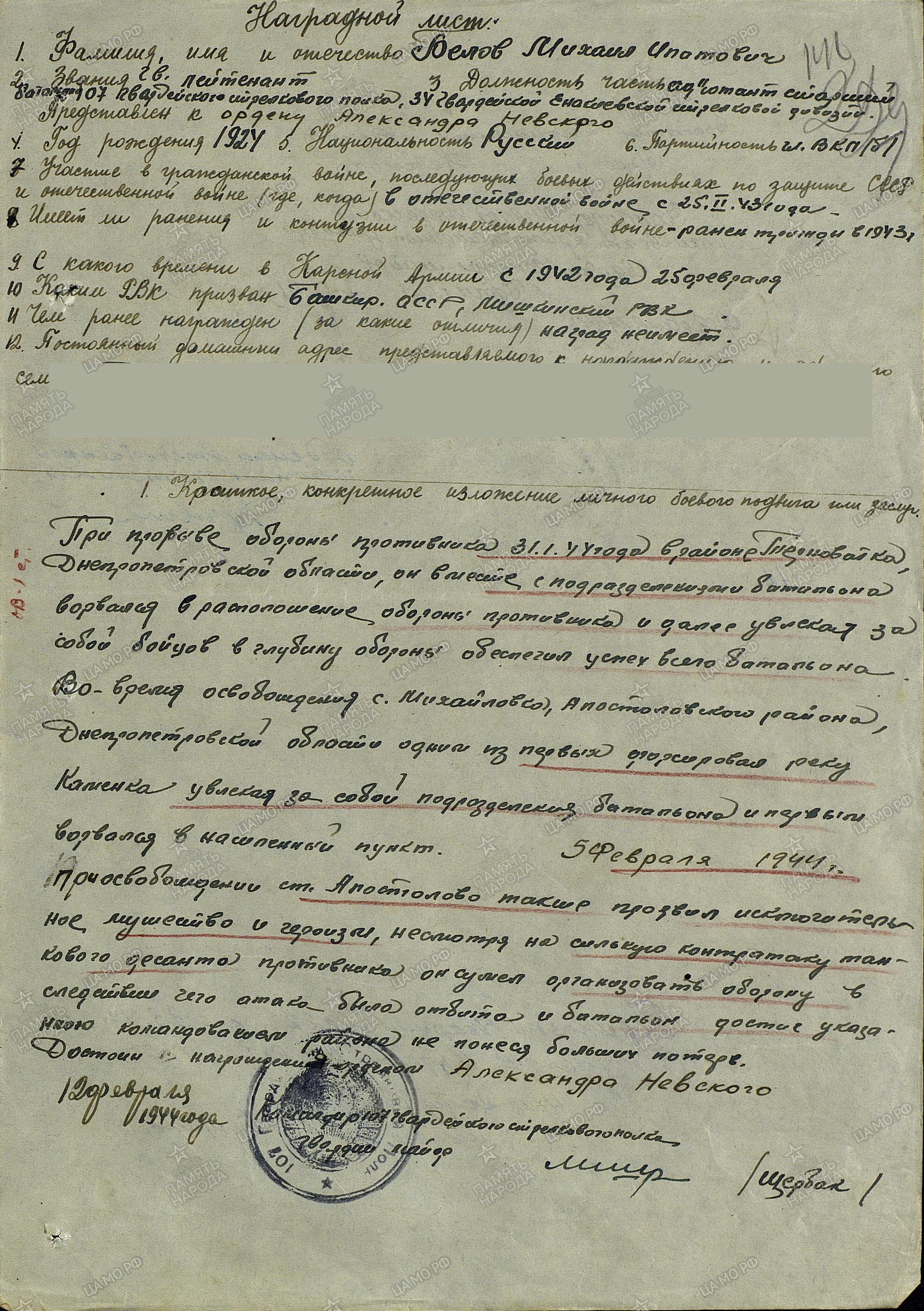 феврале 1942г. по добровольному набору был направлен в Гурьевское