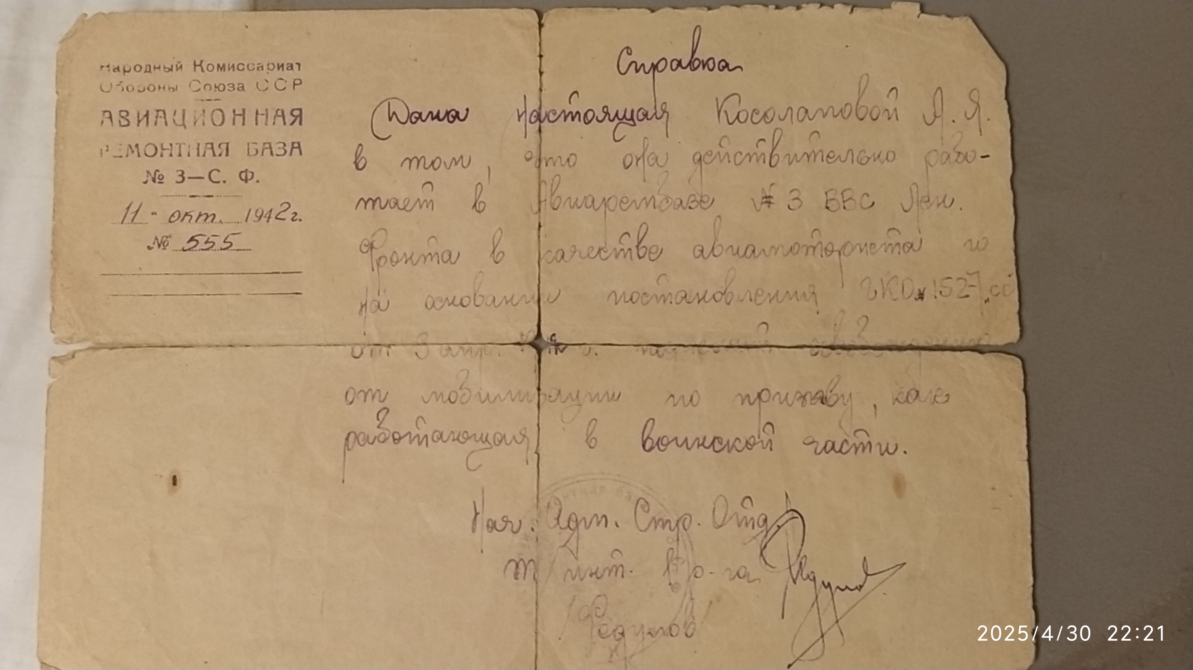 Белова (Косолапова) Анастасия Яковлевна, родилась 27 декабря 1907 года в Мордовии, с. Вечкус Ичалковского района, всю блокаду провела в Ленинграде, работала мотористом на Авиационной ремонтной базе №3-С.Ф. Ремонтировала моторы доставленных с фронта самолетов.