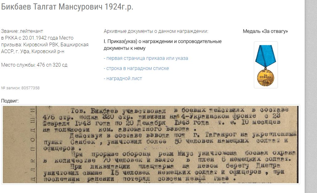 Бикбаев Талгат Мансурович участвовал в боевых действиях в составе 476 стрелкового полка 320 стрелковой дивизии на 4-Украинском фронте с 23 февраля 1943 года по 20 декабря 1943 года на должности командира автоматного взвода.