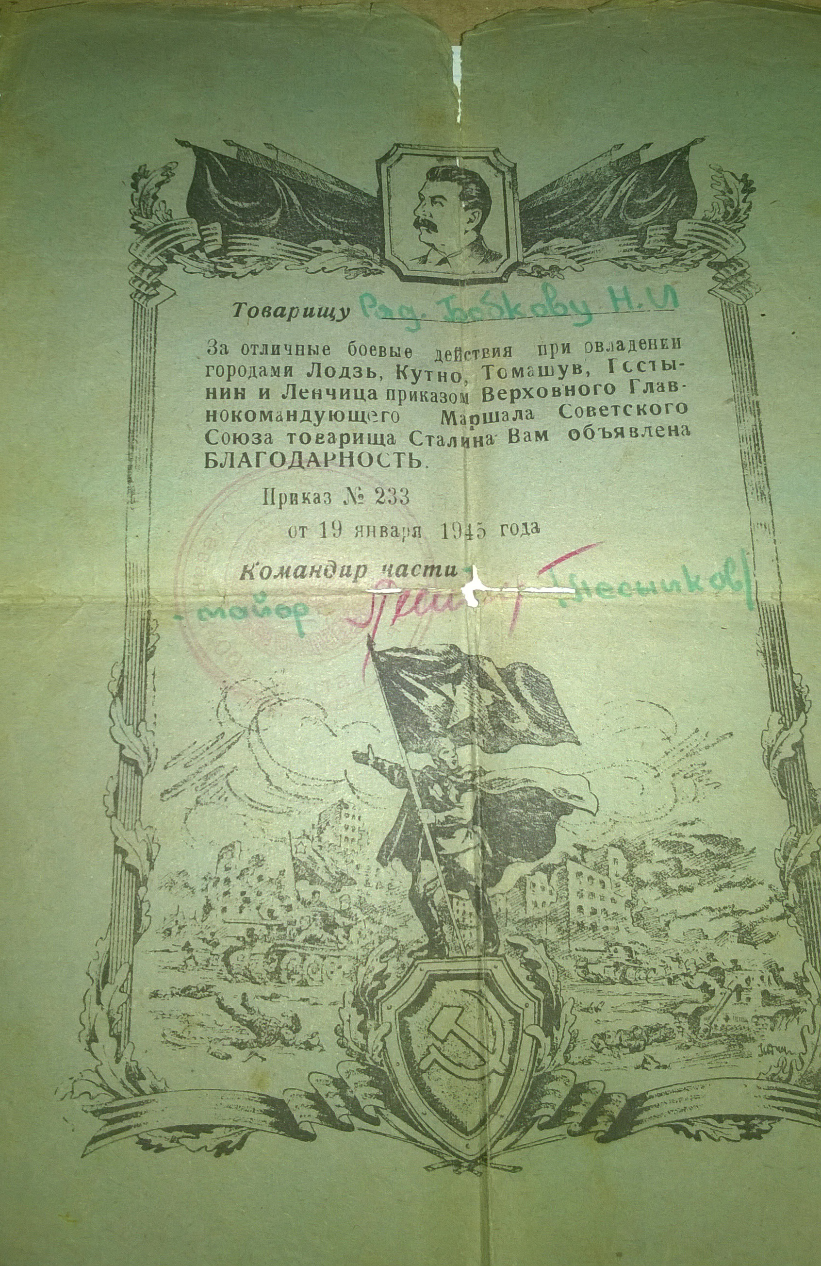 доблестным войскам 1-го Белорусского фронта, овладевшим городами Лодзь, Кутно,