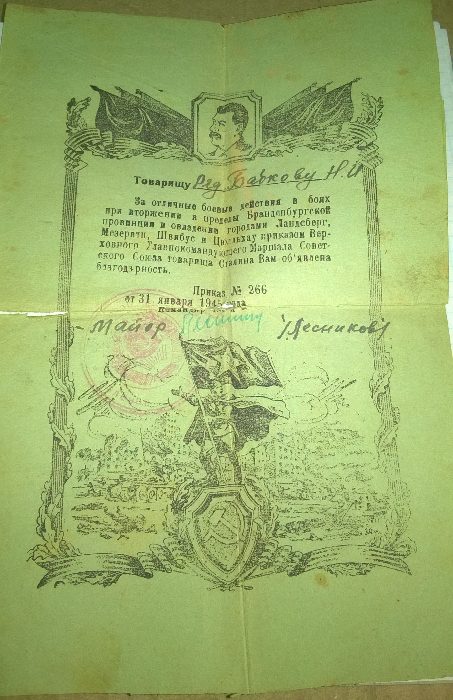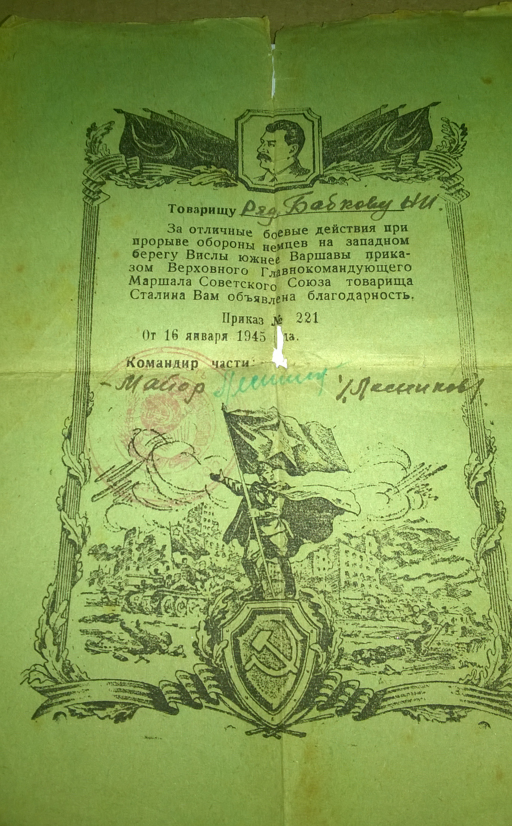Командующему войсками1-го Белорусского фронтаМаршалу Советского Союза ЖуковуНачальнику штаба фронтаГенерал-полковнику МалининуВойска
