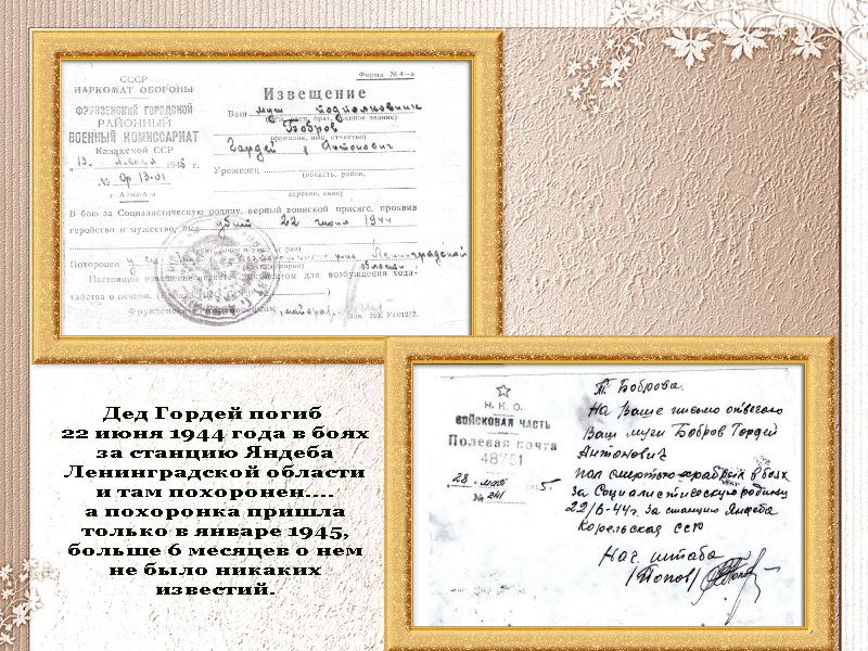 Бобров Гордей Антонович мой дед....хорошо его знаю по рассказам моего отца Боброва Льва Гордеевича....видеть деда и общаться с ним мне не довелось.....Он отдал свою жизнь за наше будущее, но он всегда с нами...память о нем жива.