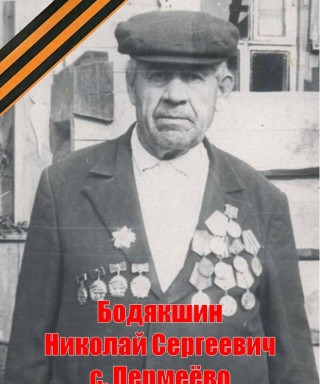 Бодякшин Николай Сергеевич, родился 09 августа 1919 года в селе Пермеёво Большеболдинского района Горьковской области. Окончил 6 классов. С 1930 - 1932 годы работал в лесу, а в 1933 году пас стадо в Безбожнике. С мая 1936 года по 1938 год работал по вербовке в городе Горьком, а в 1939 году в Павлове. (из автобиографии Бодякшина Н. С.) 5 августа 1939 году Тумботинский сельский совет Павловского района Горьковского края зарегистрировал брак между Бодякшиным Николаем Сергеевичем и Надежкиной Марией Васильевной (31.08.1919 года рождения) сохранилось свидетельство о браке от 05.08.1939 г. № 39. Но семейная жизнь оказалась не долгой и уже 4 сентября 1939 года Бодякшина Н. С. призвали в армию. Служил под Москвой в Сокольниках в первом полку связи Московского военного округа. 22 февраля 1941 года за отличные показатели в боевой и политической подготовке, отличное несение службы и примерную дисциплину награжден нагрудным знаком «Отличник РККА» (приказ народного комиссара обороны союза ССР от 22.02.1941 года № 108, за подписью маршала Советского Союза Тимошенко С. К.). «Прошел Украину, Молдавию Румынию, Болгарию, Югославию. Форсировали реки: Дон, Днестр, Днепр, Дунай – 4 раза. В боях в рукопашную не приходилось воевать, только отстреливаться во время отступления. Днепропетровск, Курская дуга тянули связь без перебоя и восстанавливали её во время боя. Победу встретил в Австрии левее Вены, встретили вместе с американскими войсками. С войны вернулся в сентябре 1947 году в воинском звании ефрейтор.» (из автобиографии Бодякшина Н. С.). Демобилизовался Николай Сергеевич в сентябре 1947 года. В 1948 году работал завхозом в школе. С 1949 года по 1954 год работал на Маслозаводе грузчиком и вторым шофером. Работал завхозом в Большеболдинской больнице 2 месяца, затем до апреля 1960 года в Большеболдинской школе. С апреля 1960 года до 15 февраля 1980 года был заведующим фермой Пермеевского колхоза «Власть советов». Был депутатом Пермеевского сельского совета с 1963 года по 1979 год. Ушел на пенсию 9 августа 1979 года. Имеет 7 детей, 12 внуков, 12 правнуков и 2 праправнука. Умер 15 октября 2009 года в возрасте 90 лет. Похоронен на Пермеевском кладбище.