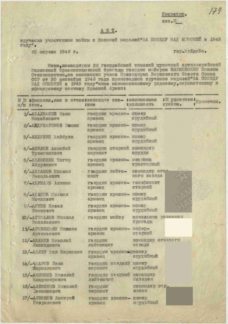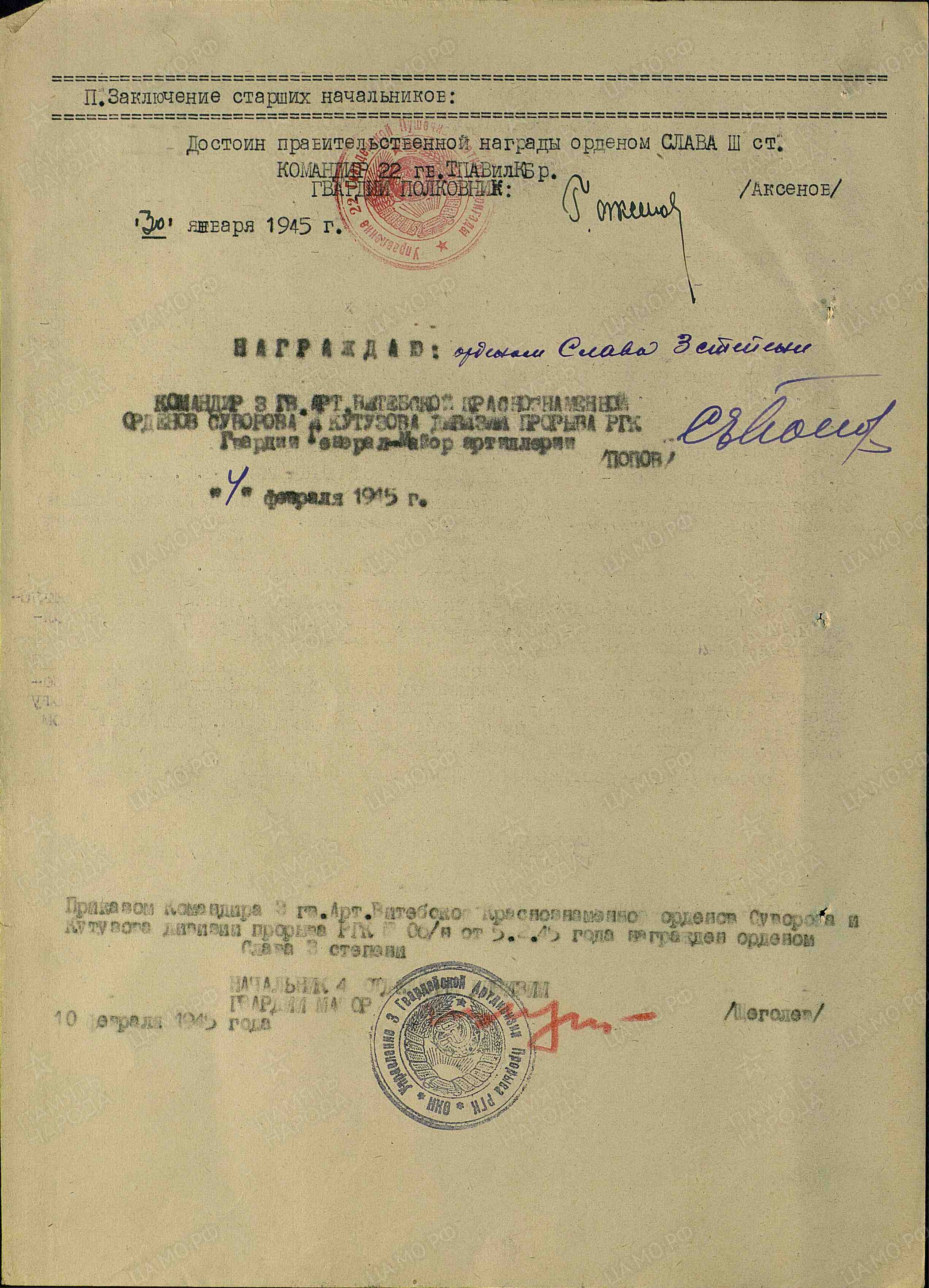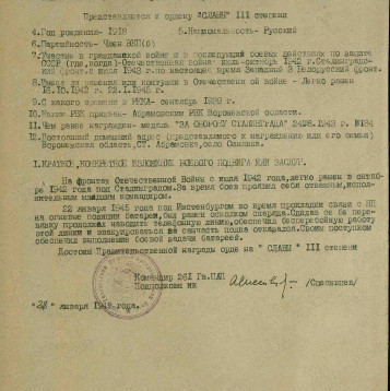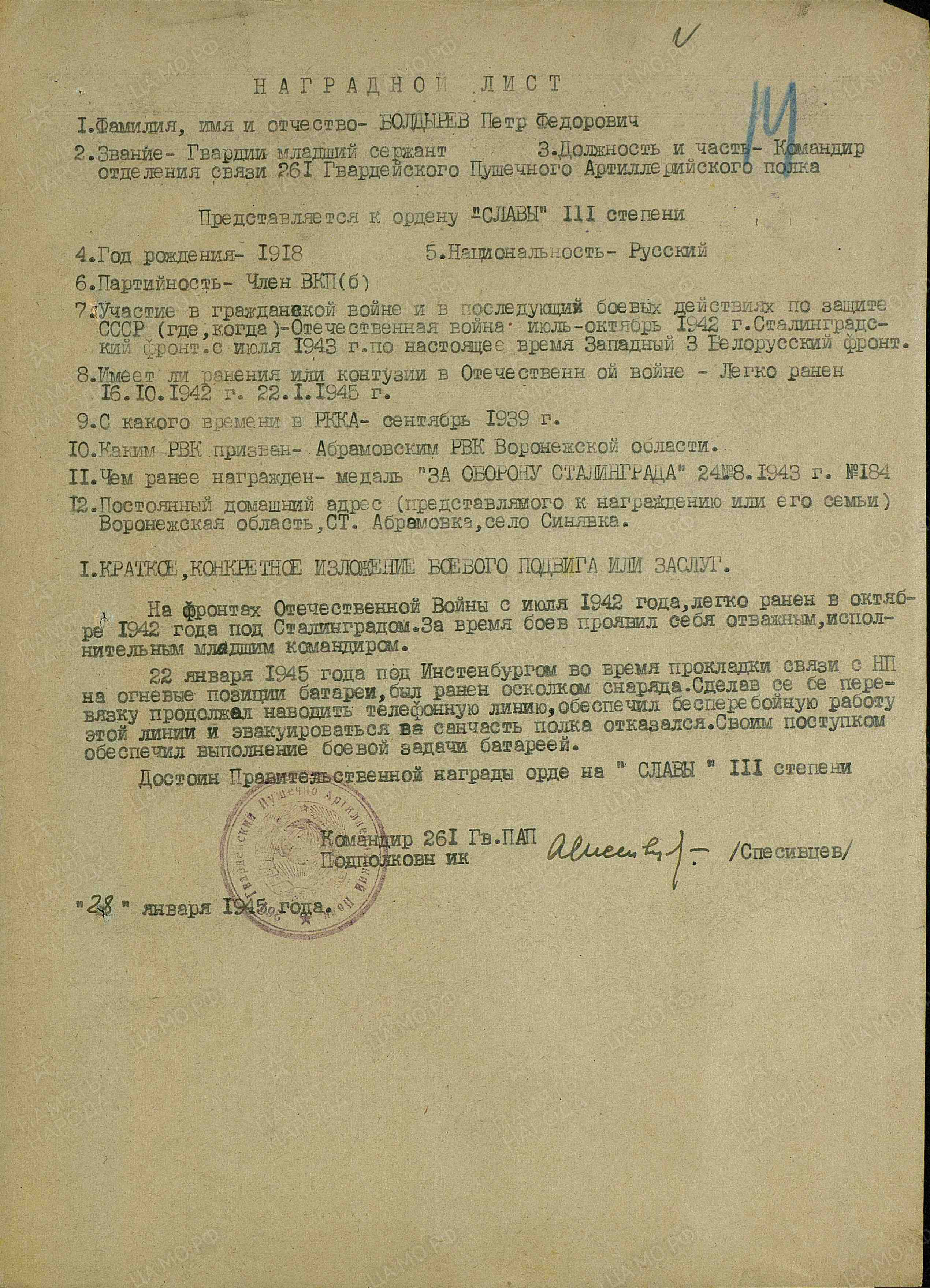На фронтах Отечественной Войны с июля 1942 года, легко ранен в октябре 1942 года под Сталинградом. За время боев проявил себя отважным исполнительным младшим командиром. 22 января 1945 года под Инстенбургом во время прокладки связи с НП на огневые позиции батареи, был ранен осколком снаряда. Сделав себе перевязку продолжал наводить телефонную линию, обеспечил бесперебойную работу этой линии и эвакуироваться в санчасть полка отказался. Своим поступком обеспечил выполнение боевой задачи батареей.
