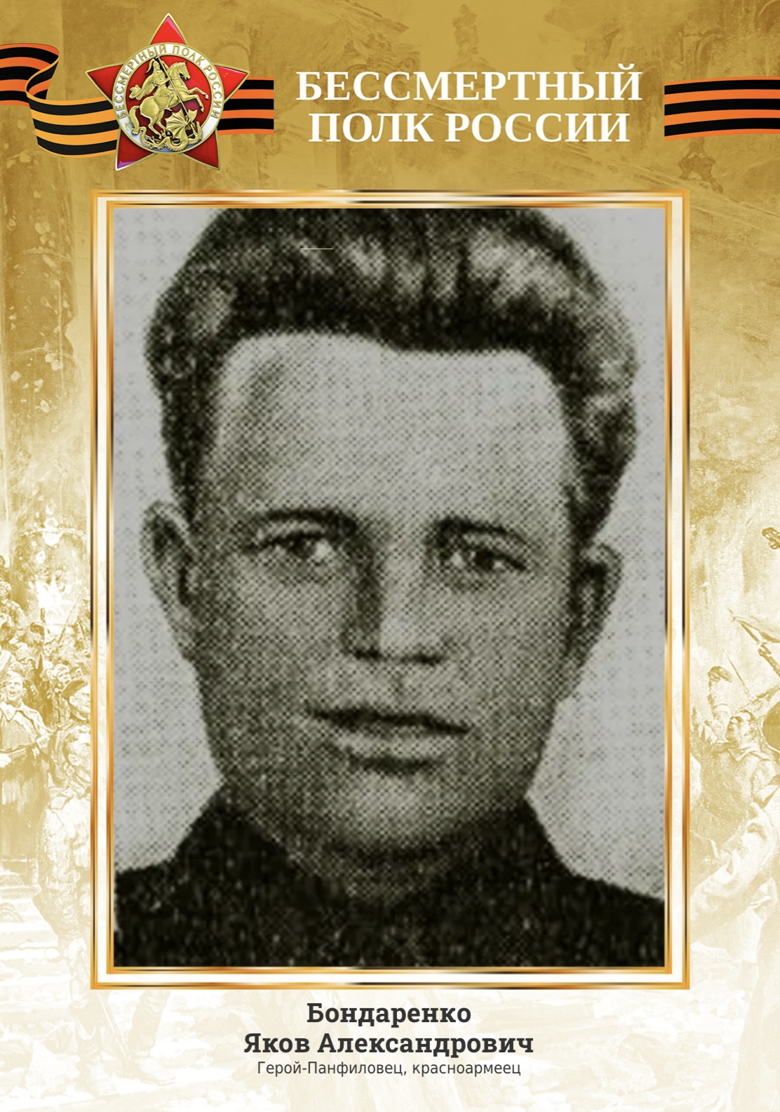 В июле 1941 года был призван в Красную Армию и отправлен на фронт. 16 ноября 1941 года у разъезда Дубосеково Волоколамского района Московской области в составе группы истребителей танков участвовал в отражении многочисленных атак противника, было уничтожено 18 вражеских танков. Это сражение вошло в историю, как подвиг 28 героев-панфиловцев. Яков Бондаренко в том бою погиб. Похоронен в братской могиле у деревни Нелидово. Награды: Медаль «Золотая Звезда» Героя Советского Союза. Орден Ленина.