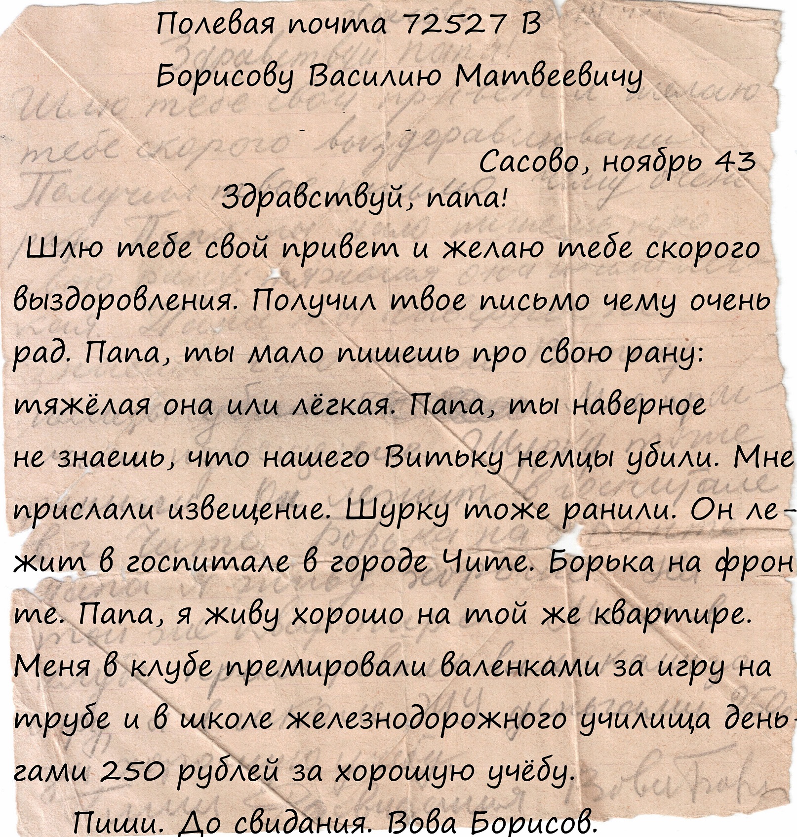 Борисов Василий Матвеевич 1895 года рождения. Призван в марте 1943 г. Сержант. В боевых действиях участвовал в составе 13 стрелкового полка 2 стрелковой дивизии 59 армии Волховского фронта. 5.09.1943 был тяжело ранен. Уволен из армии по состоянию здоровья после ранения. Инвалид ВОВ. Награжден орденом Отечественной войны II степени и медалью "За Победу над Германией". Умер в 1962 г.
