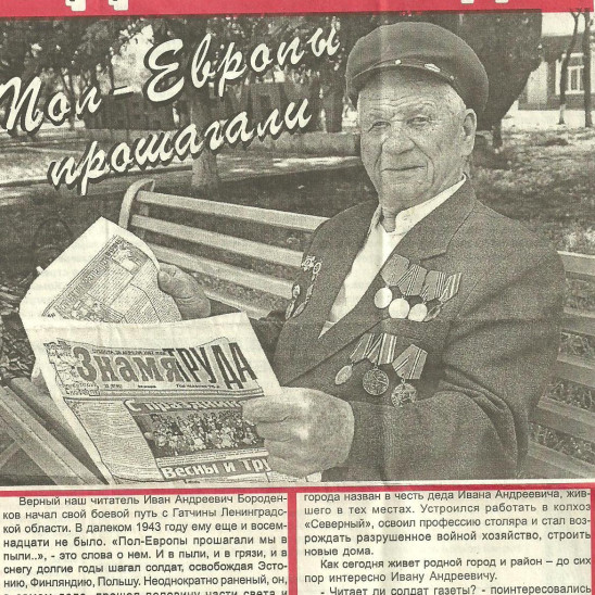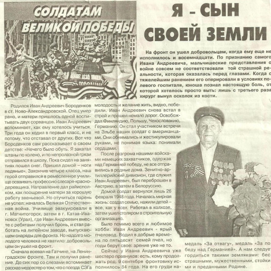 Иван Андреевич Бороденков родился в станице Новоалександровской. Окончив четыре класса, Иван Андреевич отправился в ремесленное училище осваивать профессию слесаря — краснодеревщика. К сожалению, отучиться он не успел: началась Великая Отечественная война. Училище эвакуировали, так Иван Андреевич попал в город Катав-Ивановск на литейный завод, где выпускали снаряды для фронта. Но надолго его не хватило: добровольцем ушел на фронт. Сначала воевал на Гатчине, на Ленинградском фронте, где получил ранение. Со слезами он вспоминает рассказ медсестер о том, что с поезда СЭГа его сняли как умирающего солдата. Но видно желание жить победило, и юный солдат снова встал в строй. Иван Андреевич участвовал в освобождении Финляндии, Польши, Чехословакии, Германии. Он стал участником встречи на Эльбе наших солдат с американцами. Они обнимались и жестикулировали руками, не понимая языка: понимали сердцами. После разгрома нашими войсками немецких захватчиков, одержав над Германией победу, не все отправились в родные места. Зенитно-артиллерийский дивизион, где служил Иван Андреевич, был переброшен в Австрию на два года, а затем в Белоруссию. Домой солдат вернулся лишь 26 февраля 1948 года. Началась мирная жизнь: создал семью. Работал в колхозе, затем ушел столяром в строительную организацию. На его груди награды, которыми он гордится: орден Отечественной войны первой степени, медаль «За отвагу», медаль «За победу над Германией»