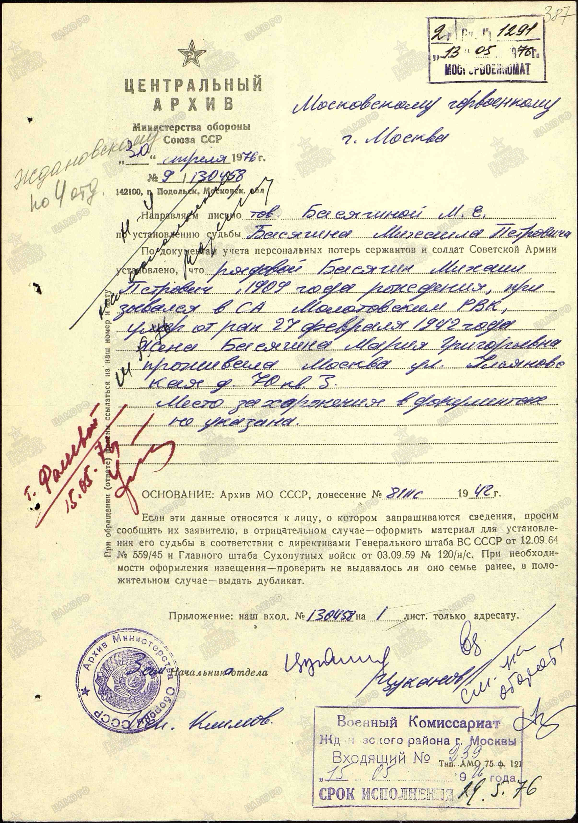 Мой дедушка Босягин Михаил Петрович, москвич, 1909 года рождения, призвался в ряды Красной армии Молотовским РВК в 18 июля 1941 года в самом начале войны. Он защищал мой любимый и родной город Москву, в котором оставил свою семью: маму, жену и маленького сына. Во время перерыва между боями за Москву на привале неожиданно для всех бойцов разорвалась мина, осколки мины попали в деда: повредили позвоночник и нанесли тяжёлые раны, с которыми организм не справился. 27 февраля 1942 года дедушка умер от ран в московском военном госпитале. Ему было 33 года. А пятилетний сын, мой папа, так и не дождался любимого папку с фронта. Похоронен дедушка в Москве на Преображенском кладбище. Каждый год в любую погоду утром 9 мая мы с папой приходим на его могилу почтить его светлую память, с благодарностью приносим цветы и георгиевскую ленточку. Так начинается наш День Победы.