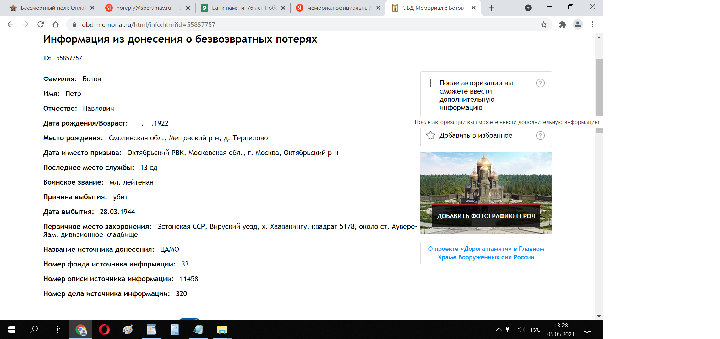 Место призыва: Октябрьский РВК, г. Москва Воинская должность: мл. лейтенант. Командир взвода Химзащиты. Последнее место службы: 172 стрелковый полк, 13 СД - по информации "ОБД Мемориал" Убит 28.03.1944. Первичное место захоронения: Эстонская ССР, Вируский уезд, х. Хаавакингу, квадрат 5178, около ст. АувереЯам, дивизионное кладбище - по данным "ОБД Мемориал". Операции, в которых Участвовал Пётр Ботов, неизвестны, к сожалению.