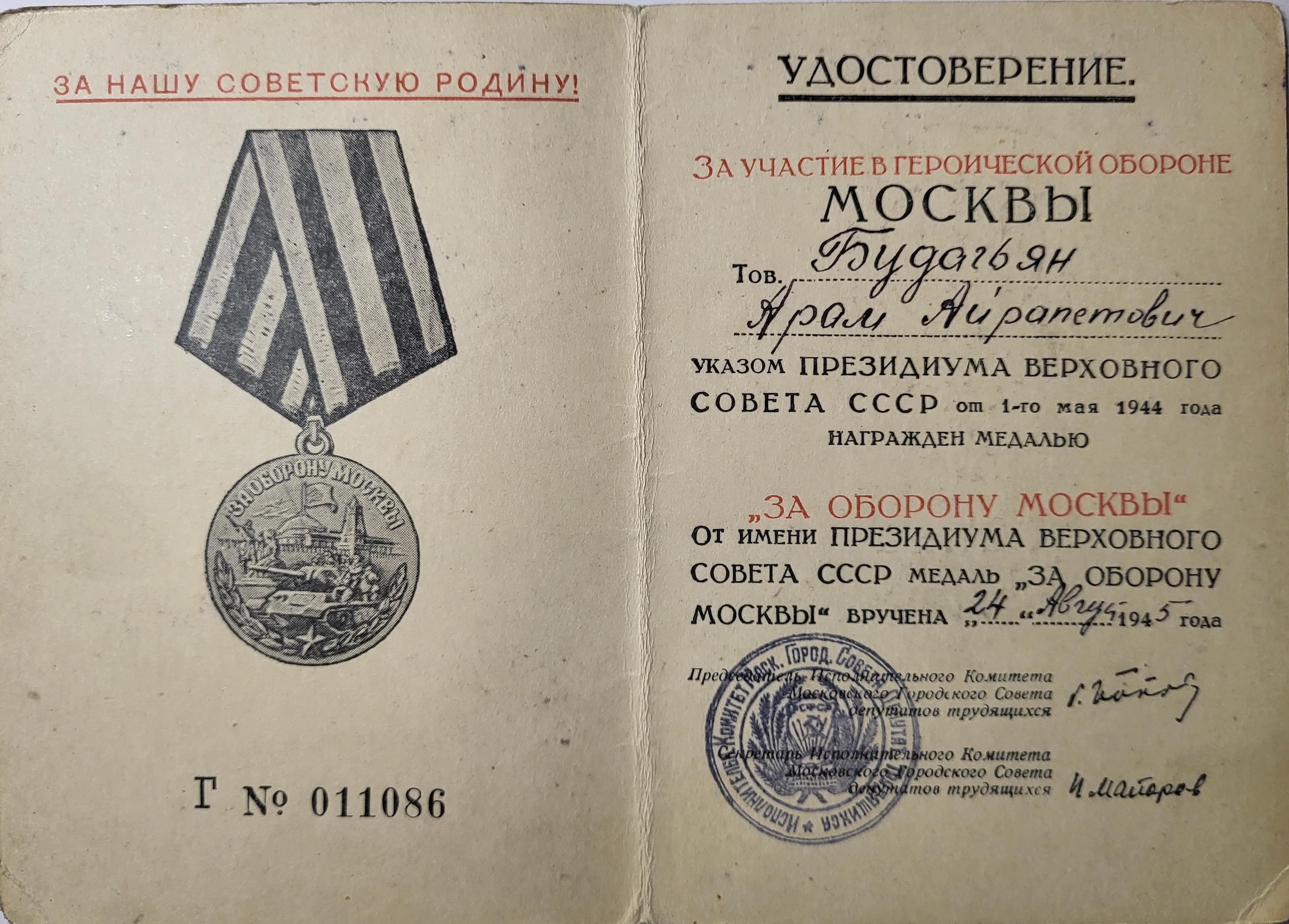 Штыки от стужи побелели, Снега мерцали синевой. Мы, в первый раз надев шинели, Сурово бились под Москвой. Безусые, почти что дети, Мы знали в яростный тот год, Что вместо нас никто на свете За этот город не умрет. Игорь Иванов Мой отец, Арам Будагян, изначально участвовал в организации фортификационных сооружений в 1941 году под Смоленском - рыл противотанковые рвы, помогал устанавливать дополнительные сооружения, которые не позволили бы врагу прорвать нашу оборону. Позже был призван, как солдат, к обороне Москвы. Участвовал в оборонительной фазе. Награжден медалью "за оборону Москвы". На тот период являлся комсомольцем, секретарем комсомольской организации. Будучи аспирантом на тот период, мой отец проживал в Москве, где ему была выделена маленькая комната в доме, находящемся на ул. Малая Никитская, в непосредственной близости от дома Берии. Более подробной информации уже не имею возможности сообщить, т.к. многое, к великому сожалению, уже не помню. Я 1944 года рождения. В результате кровопролитных боёв и упорного сопротивления немецким захватчикам, благодаря мужеству и самоотверженности наших советских солдат, одним из коих являлся мой отец, наступление фашистов на Москву было остановлено. Я горжусь тем, что мой отец внес свою лепту в оборону столицы России! К месту будет вспомнить слова маршала Г.К.Жукова:" Когда меня спрашивают, что больше всего запомнилось из минувшей войны, я всегда отвечаю: оборона Москвы". Памяти Г.К.Жукова Бывает так, хоть в прорубь головой, Когда война идёт не по законам. И каждый бой, он, как последний бой, А за спиной уже ни батальона. Но исчезает с неба синева, И тучи снова наползают ловко. Неотделимы Жуков и Москва, Неотделимы Жуков и Стрелковка. Но у него сожгли в Стрелковке дом, В котором похозяйничали гады, И он представит бывший дом с трудом И содрогнутся на груди награды. На пепелище он не встретит мать. Одна печаль, одни сплошные беды. И дома нет и некому обнять Прославленного Маршала Победы. Какая синь сегодня над Москвой, Какая синь над бывшею Стрелковкой! И Маршал в мыслях в дом заходит свой И смахивает слёзы с глаз неловко.