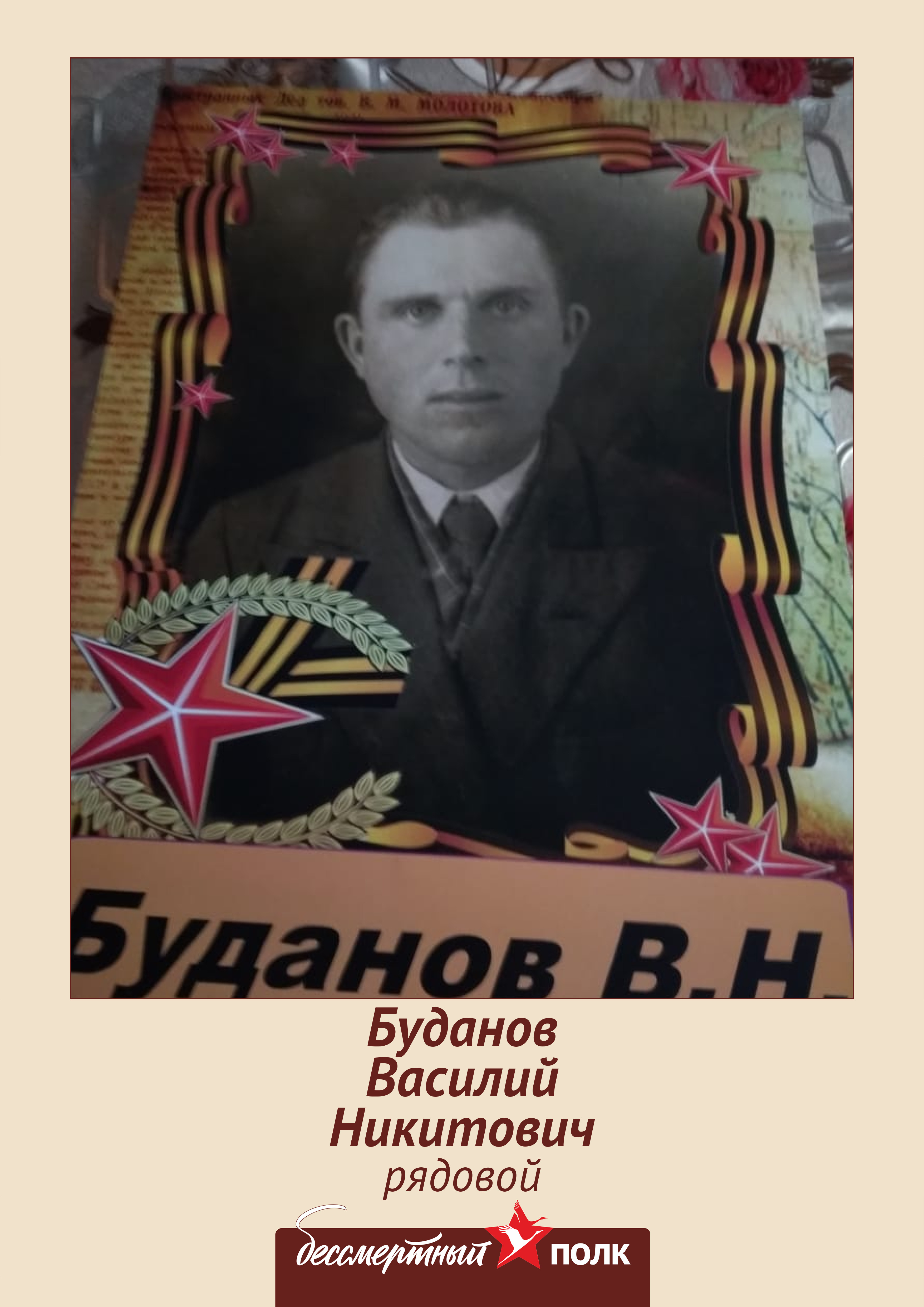Стрелковый полк с июня 1941 года по апрель 1944 года. Полевой передвижной госпиталь - 466. Школа поваров, курсант с декабря 1944 года по январь 1945 года. Награды ветерана - Медаль «За победу над Германией в Великой Отечественной войне 1941-1945 гг.» Биография после войны После войны работал трактористом в Купавне. Женился, имел 4 детей. В 1952 году заболевание катаракта, инвалид 1 группы по зрению. Работал на УПП - 12. Воинское формирование, в котором закончил войну: 2-ой Белорусский фронт.