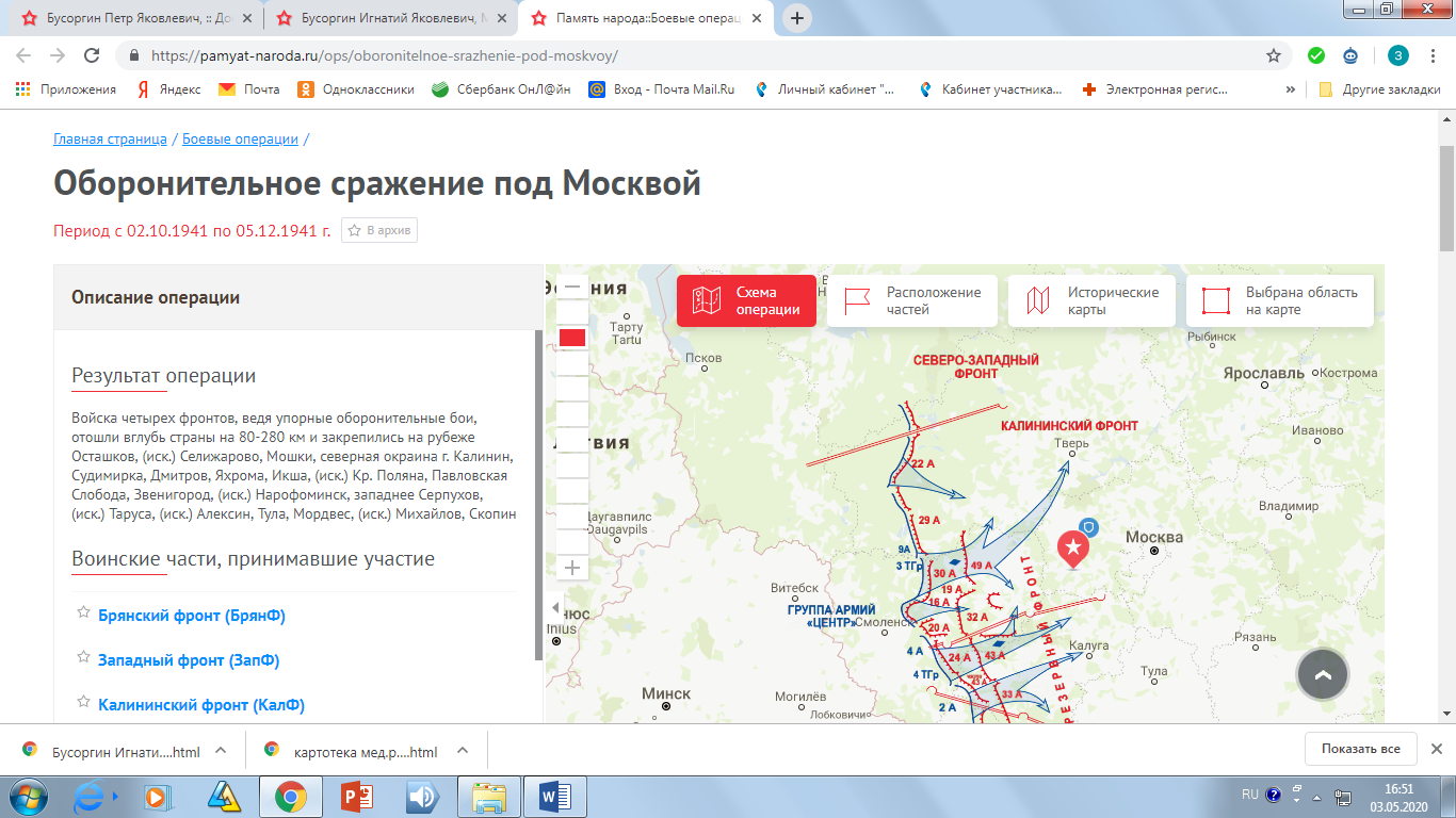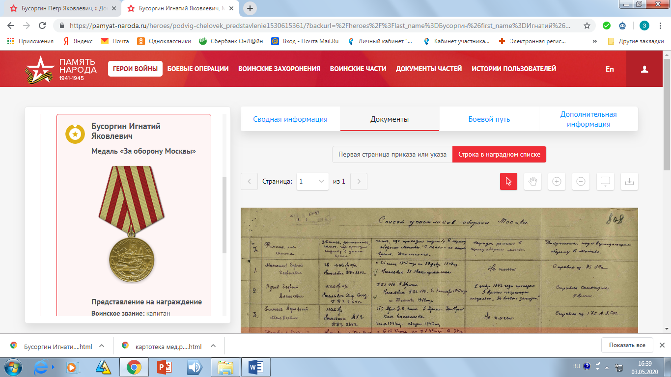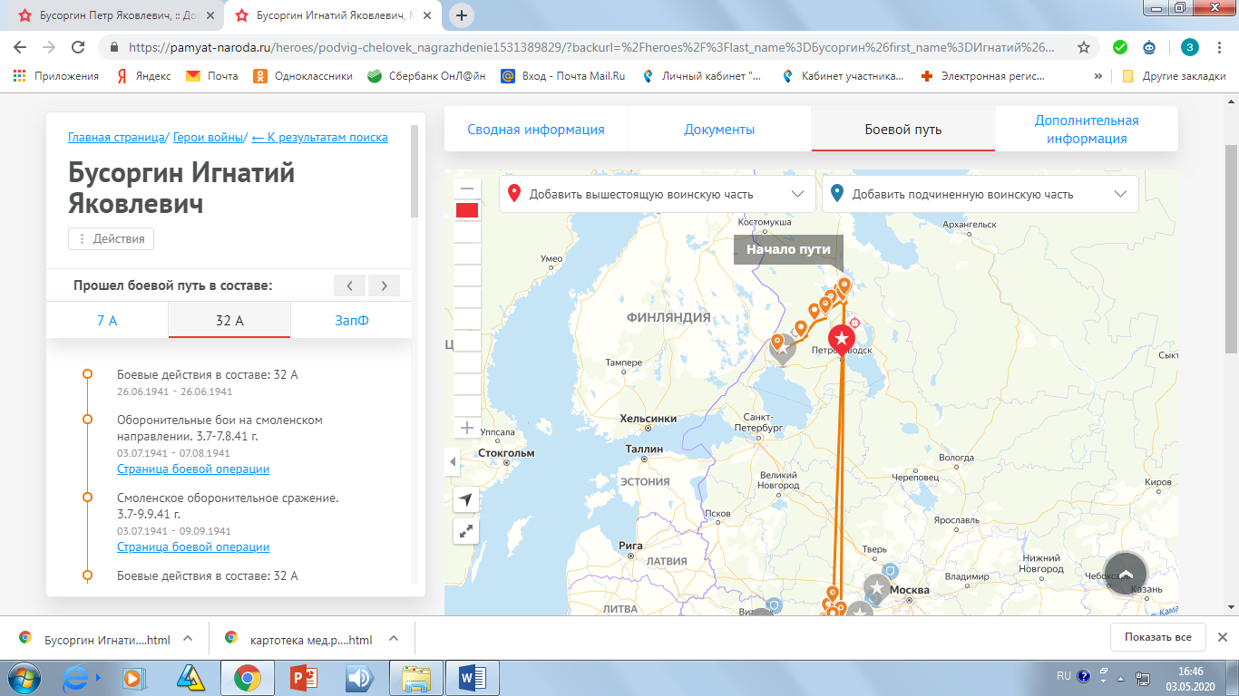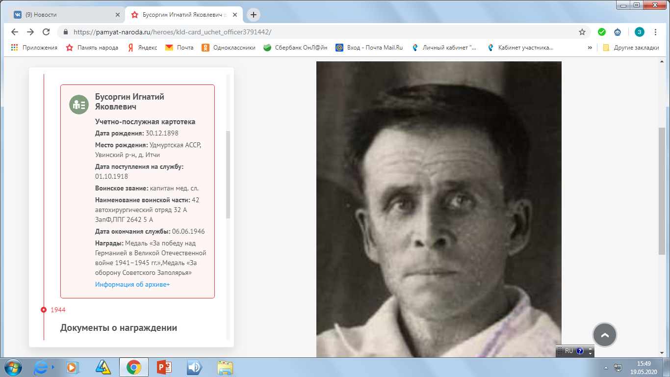 Мой дедушка, Бусоргин Игнатий Яковлевич, капитан медицинской службы, военный врач-хирург полевого передвижного военного госпиталя (ППВГ) 2642. Годы жизни 31.12.1898-01.04.1968г. Родился в д.Итчи Увинского района Удмуртской АССР. Был призван на военную службу с июня 1941 года Алатырским РВК Чувашской АССР и демобилизовался 6 июня 1946 года. Прошел боевой путь в составе 7А 32 АЗап Ф 5А 7А 32 АЗапФ 5А. Участвовал в оборонительных боях смоленского направления; в смоленском оборонительном сражении; в оборонительном сражении под Москвой; оборонительной операции на малоярославецком и можайском направлениях; в разгроме финских войск в Карелии; Свирско-Петрозаводской наступательной операции (операция 4 удара). Из наградного листа: "Будучи врачом-ординатором, не жалел своих сил в процессе обслуживания раненных. Проводил много занятий со средним медицинским персоналом, подготавливая их на новые кадры. Большой заботой и вниманием окружал раненных в процессе своей работы в перевязочной и при лечении их в палате".Его заслуги перед Родиной отмечены: "Орденом «Красной Звезды", медалью " За оборону Москвы".
