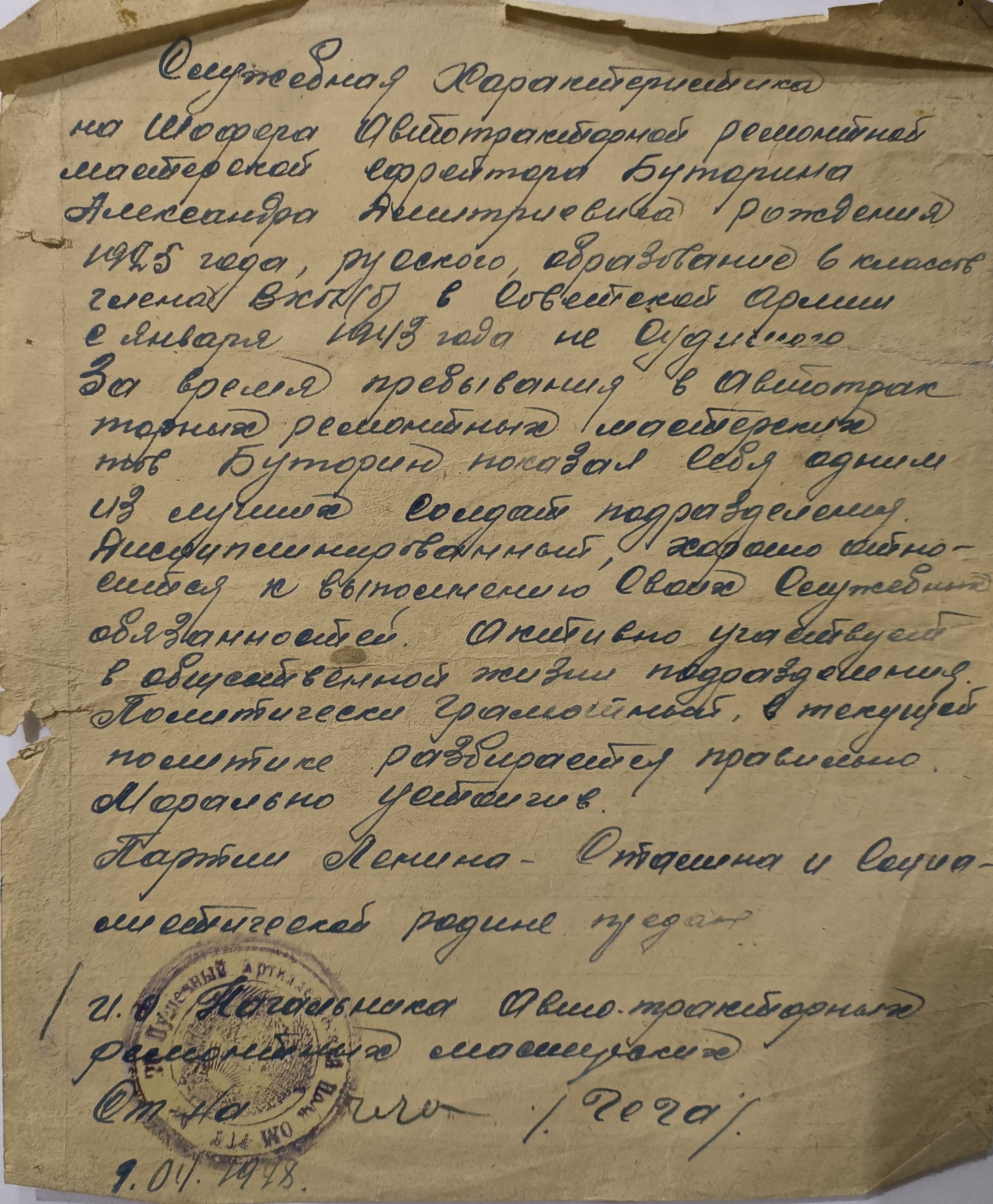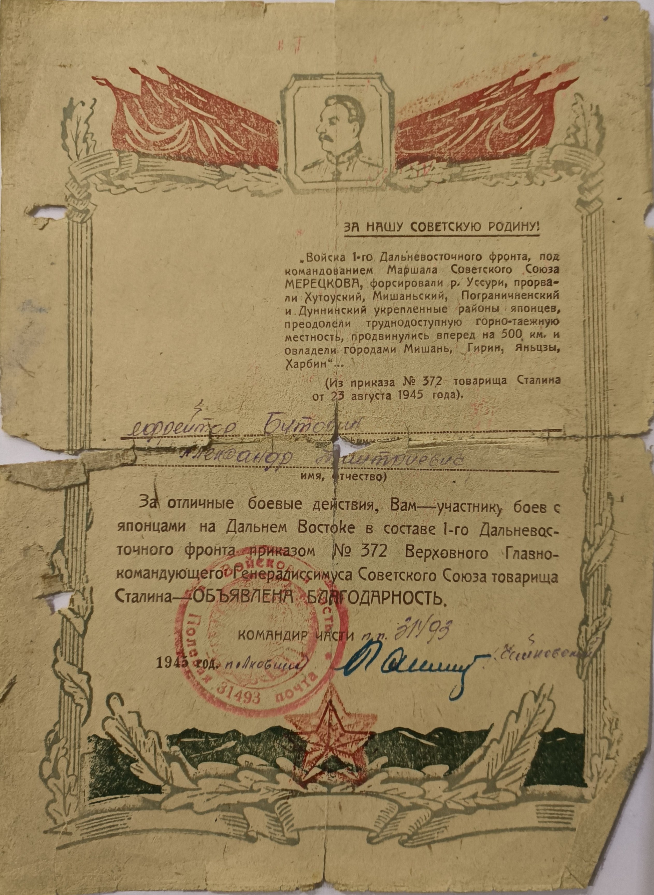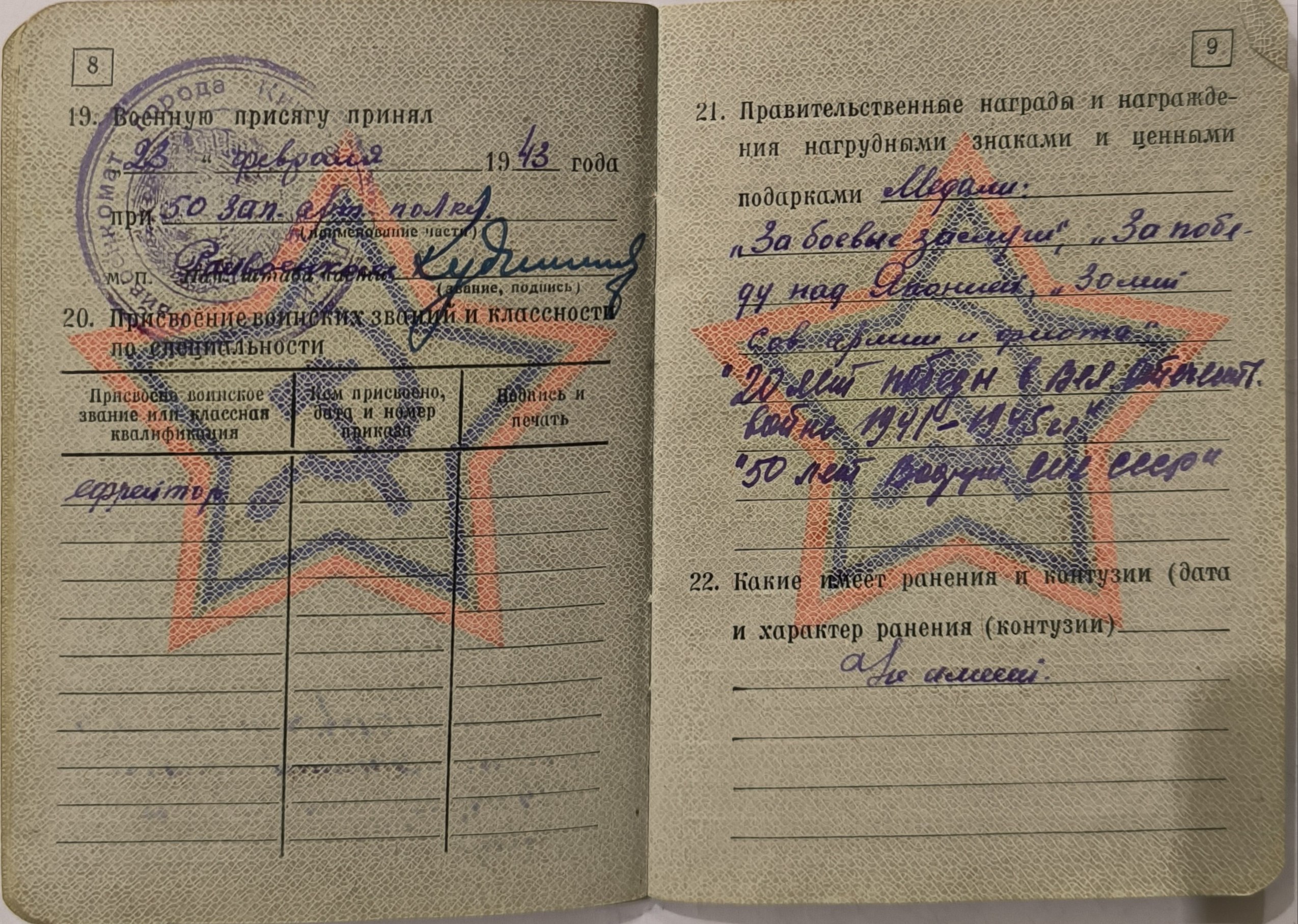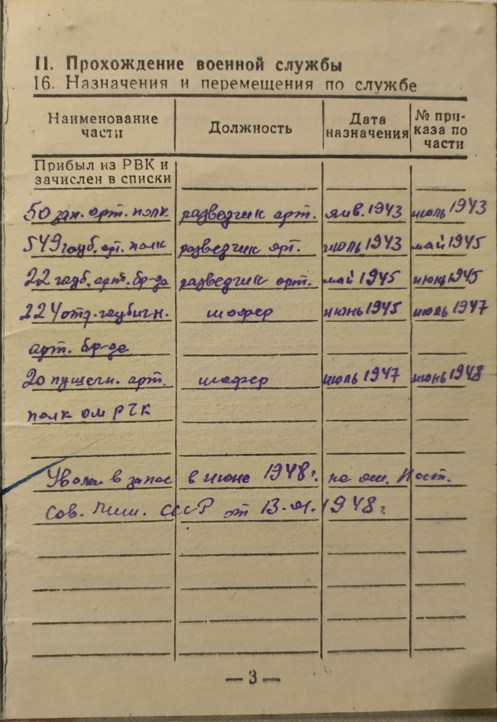 Был призван в ряды Советской армии 9 января 1943 года, в возрасте восемнадцати лет. С января 1943 года по июль 1943 года служил артиллеристом разведчиком в 50 западном артиллерийском полку, с июля 1943 года по май 1945 года служил артиллеристом разведчиком в 549 гаубичном артиллерийском полку, с мая 1945 года по июнь 1945 года служил артиллеристом разведчиком в 22 гаубичном артиллерийском полку. Принимал участие в Русско-Японской войне. С июня 1945 по июнь 1948 года был шофером в 224 отдельной гаубичной артиллерийской бригады. Награжден Правительственными наградами: "За боевые заслуги", "За победу над Японией" и другими наградами.