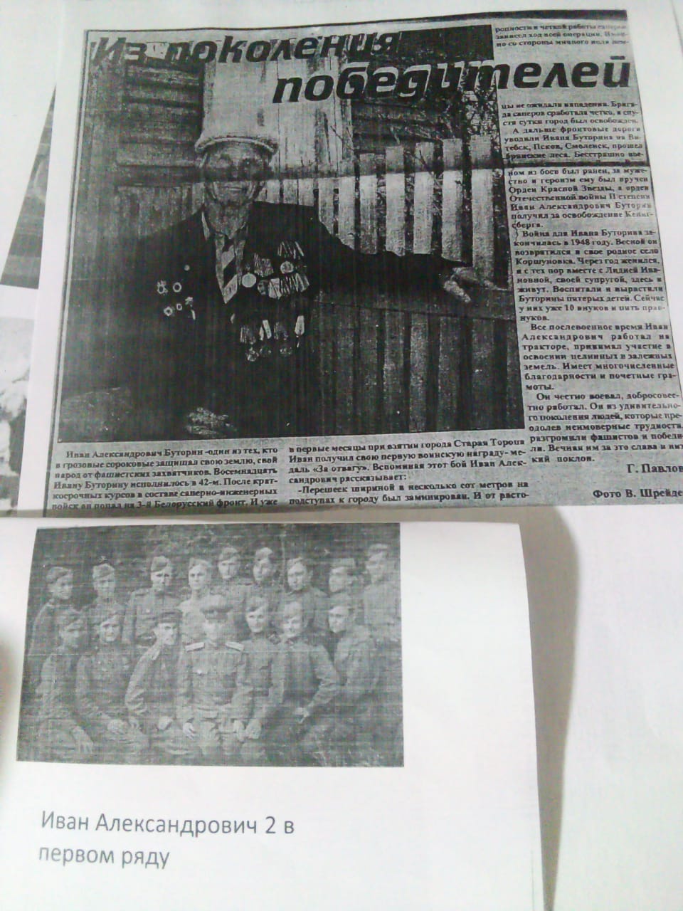 Когда началась война деду Ивану было 17 лет. На войну с первых дней забрали отца (Александр Гаврилович-оборонял Ленинград, награжден медалью «За оборону Ленинграда») и старшего брата (пропал без вести в 1943 году под Ленинградом). В первый год войны прадед работал вместе с женщинами и стариками в колхозе: косили сено, убирали хлеб, растили скот. Он стал единственным мужчиной в семье. 20 декабря 1942 года ему пришла повестка - явиться в военкомат. Деду Ивану только исполнилось 18 лет, он мечтал пойти на фронт – бить врага. Его сначала привезли в Тюкалинск, затем отправили в Омск, далее отправили в Красноярск. Там расположился учебный центр, где обучали сапёрному и инженерному делу. Учили минировать и разминировать свои и немецкие мины. Обучали стрельбе, тактической подготовке.