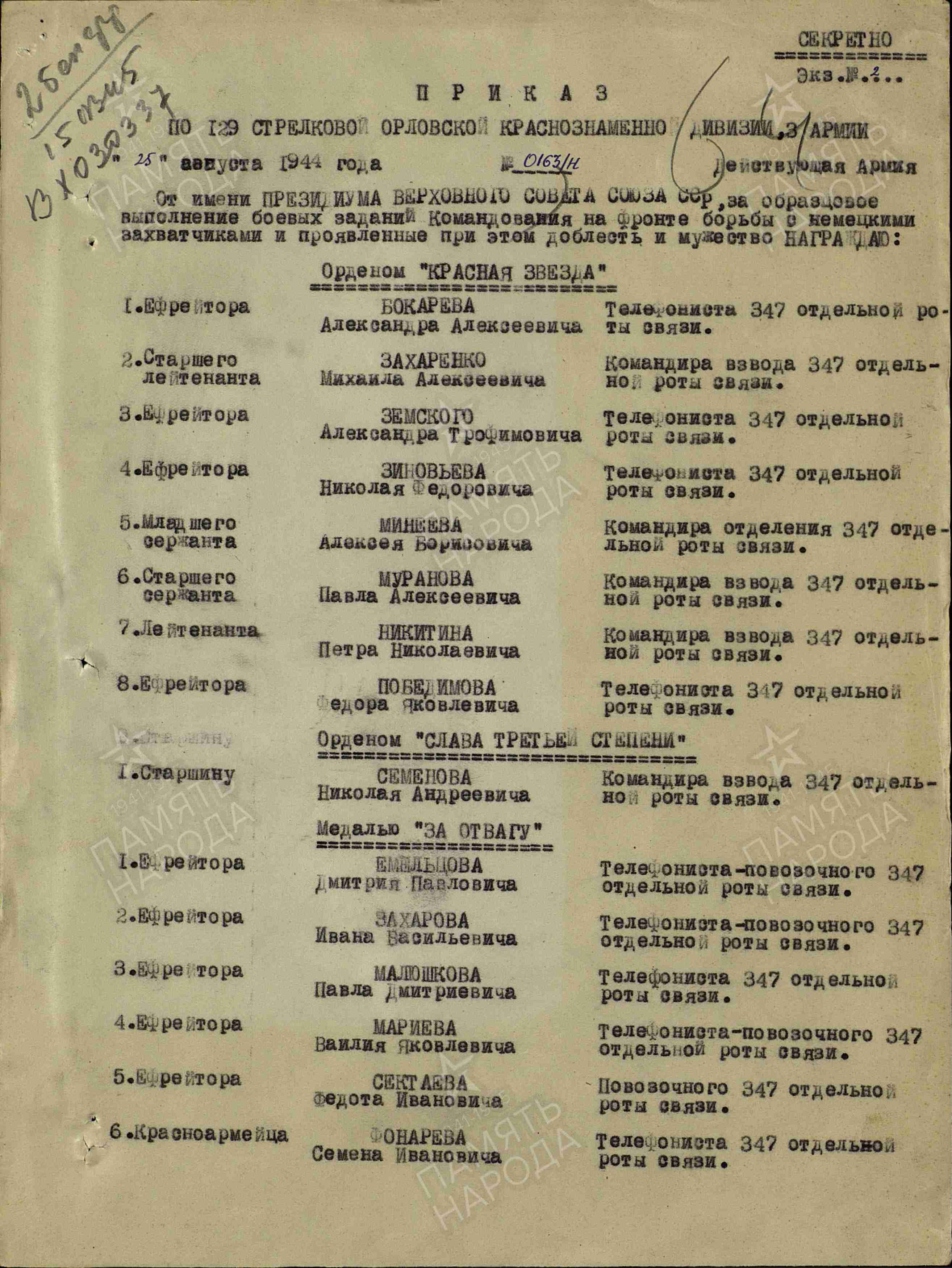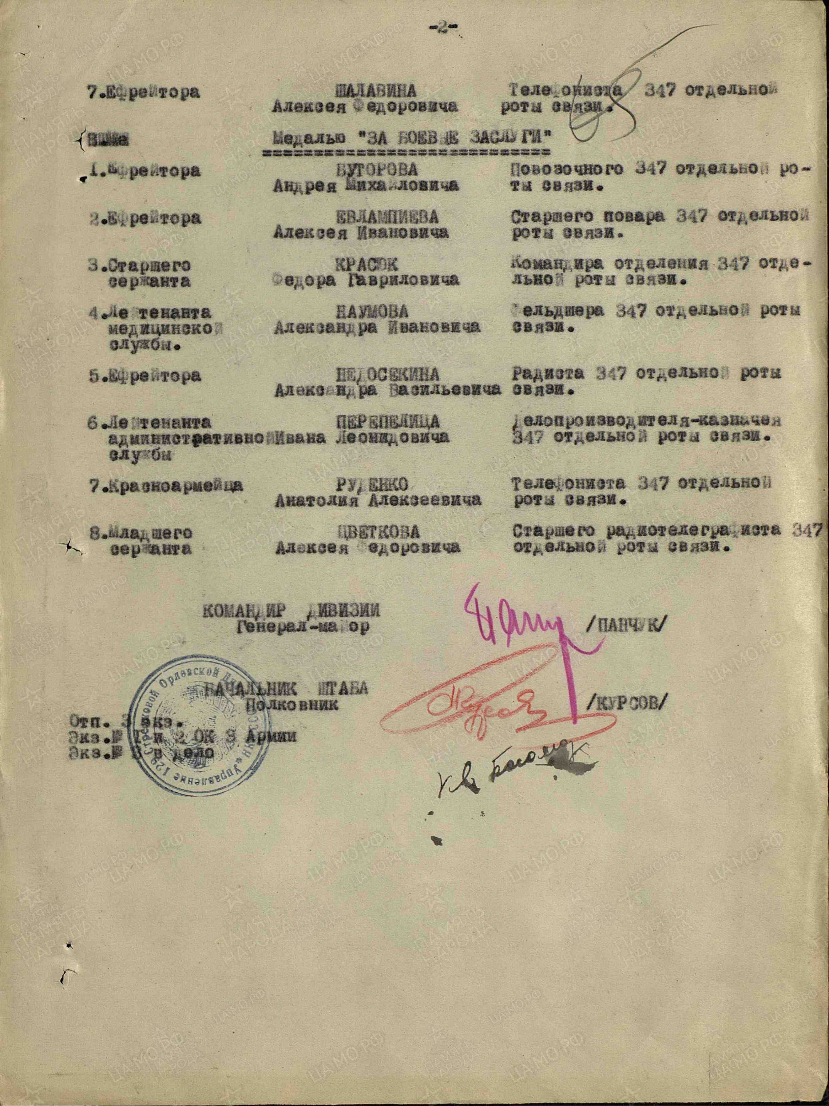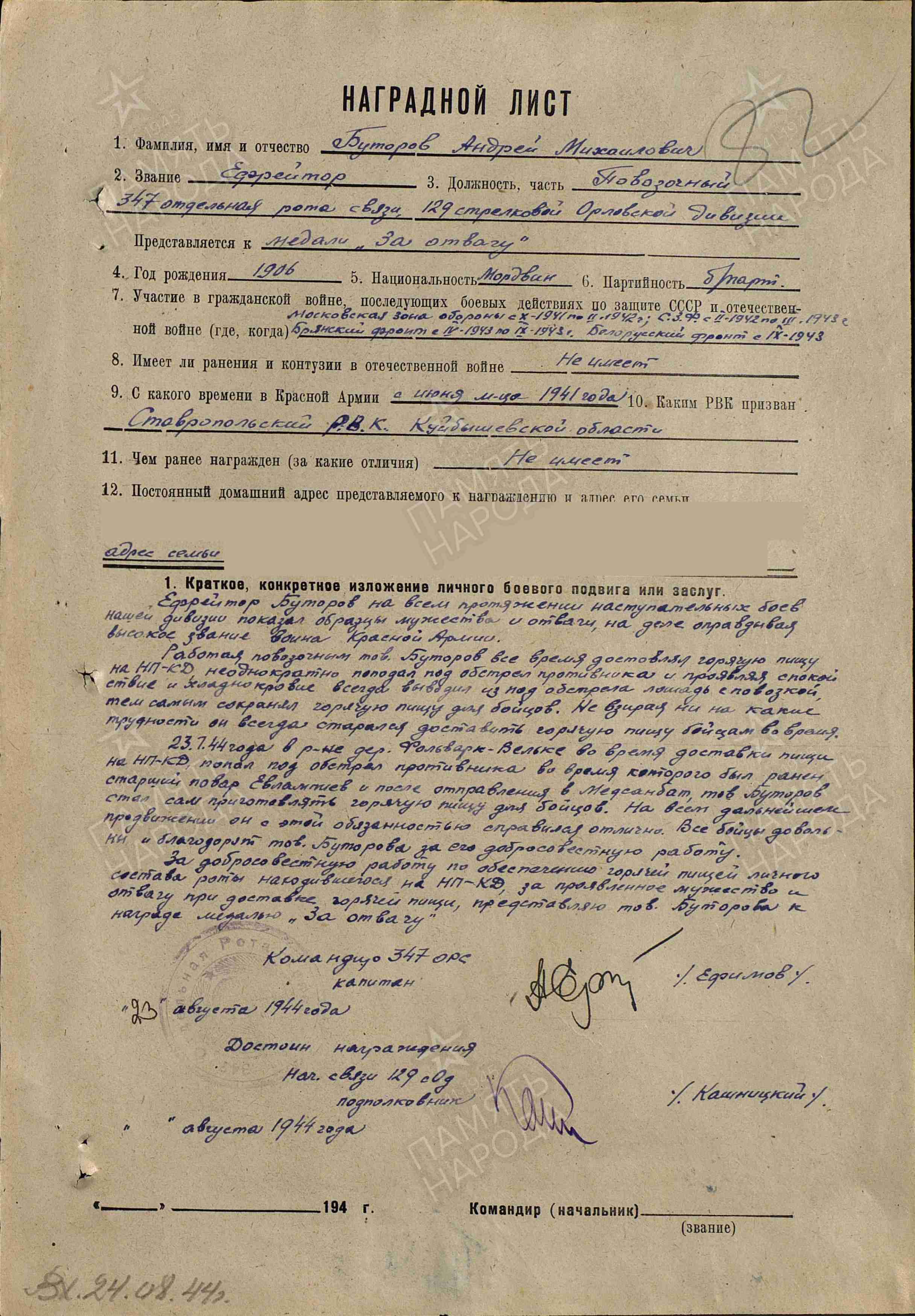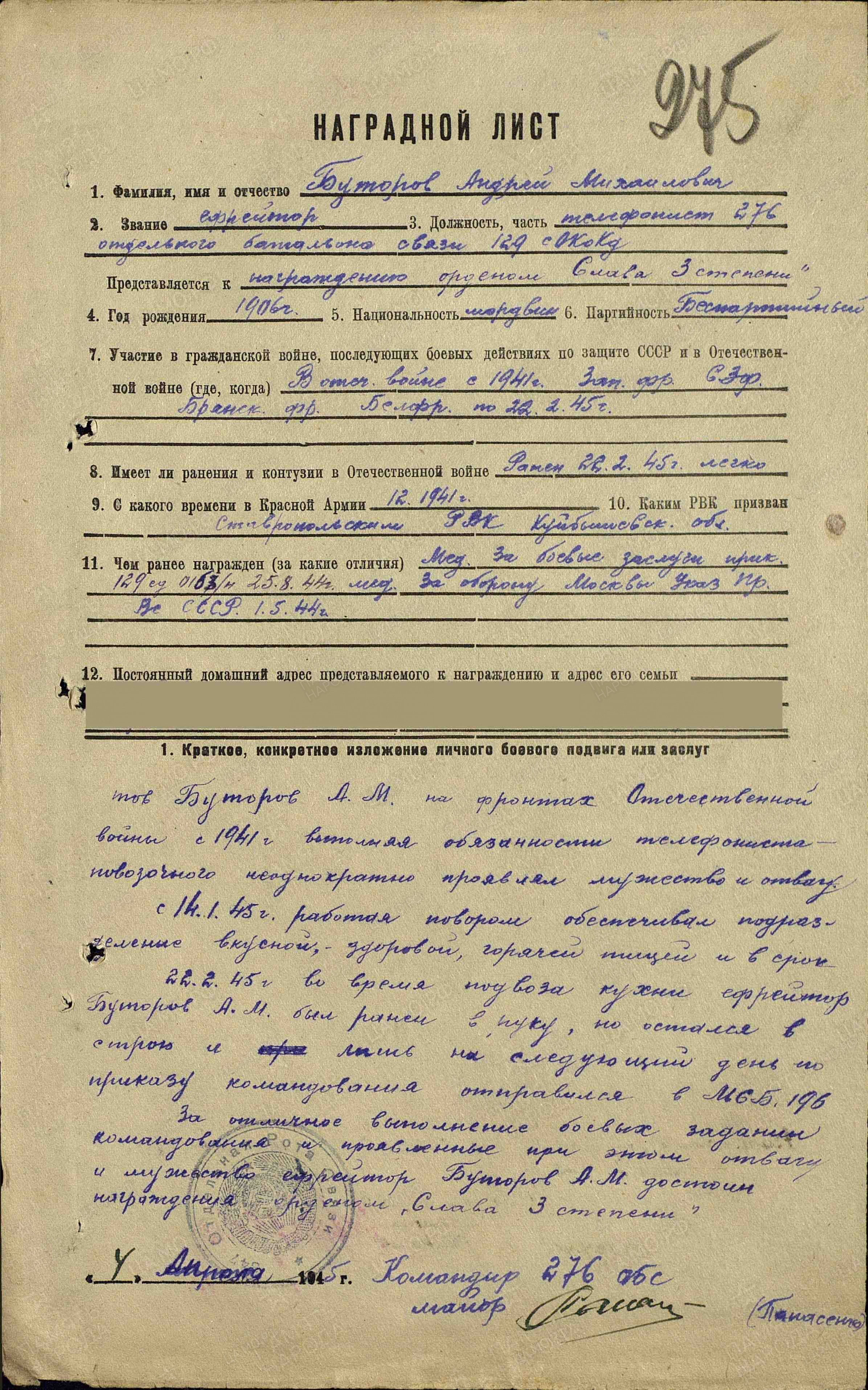 Прапрадед Буторов Андрей Михайлович Место рождение: село Верхнее Санчелеево Ставропольского района Куйбышевской области, 1906 г.р. Буторов Андрей Михайлович призван в РККА в июне 1941 года Место призыва: Ставропольский ГВК, Ставропольский р-н Куйбышевской области. Звание: ефрейтор. Воевал: телефонистом -возничим 347 отдельной роты связи 127 стрелковой Орловской дивизии . Участвовал в Московской зоне обороны с октября 1941 гола по февраль 1942 года. Наступление на Москву было предпринято в конце сентября, после того, как силы вермахта смогли сломить сопротивление частей Красной Армии под Смоленском. В этом наступлении было задействовано более половины сил фашистов, находившихся на советско-германской границе. Задачей группы «Центр» стало осуществление плана «Тайфун». Битва за Москву с сентября 1941 по апрель 1942-го стала крушением плана Гитлера «Барбаросса» по захвату СССР за 12 недель. И 5 декабря первая, оборонительная часть Битвы за Москву, завершилась успехом Красной Армии. Награжден медалью «За Боевые заслуги» 25 июля 1944 года, Награжден медалью «За Отвагу» 25 августа 1944 года, Из представления к награждению медалью «За Отвагу»: «Ефрейтор Буторов все время доставлял горячую пищу на КП- КД, неоднократно попадал под обстрел противника, и, проявляя спокойствие и хладнокровие всегда выводил из-под обстрела лошадь с повозкой, тем самым сохранял горячую пищу для бойцов. Не взирая ни на какие трудности он всегда старался доставить горячую пищу бойцам. 23.01.1944 г. в районе деревни Фольварк-Вельке попал под обстрел противника, и был ранен старший повар Евлампиев, тов. Буторов стал сам приготовлять горячую пищу для бойцов. » Награжден медалью «За Оборону Москвы » 27 сентября 1944 года. Из представления к награждению орденом Славы III степени: «Товарищ Буторов А.М. на фронтах Великой Отечественной войны с 1941 года выполняя обязанности телефониста- повозочного неоднократно проявлял мужество и отвагу. 14.01.1945 года работая поваром обеспечивал горячей, вкусной пищей подразделение в срок. 22.02.1945 года во время подвоза пищи Ефрейтор Буторов А.М. был ранен в руку .юно остался в строю и лишь на следующий день, по приказу командования, отправился в медсанбат." Вернулся с фронта в 1945 году. До пенсии проработал в родном колхозе «Правда» Вечная память Героям, защитившим страну от фашистских захватчиков!!! Похоронен Андрей Михайлович 15 января 1987 года на местном кладбище в селе Верхнее Санчелеево. Его имя занесено в Книгу Памяти Самарской области № 34