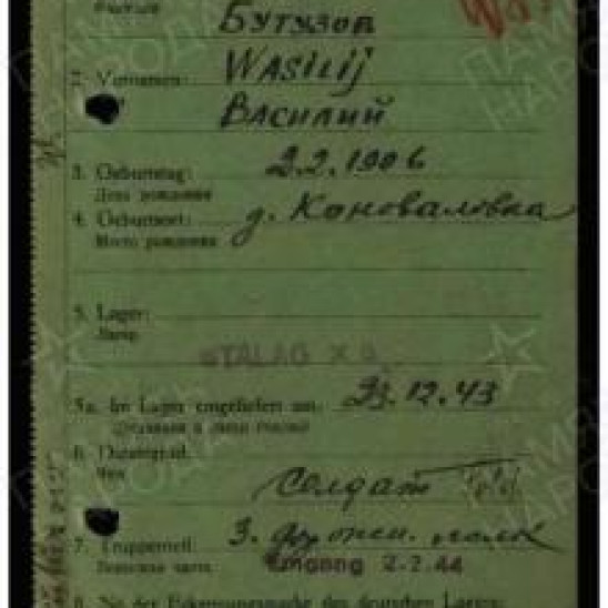Бутузов Василий Мефодиевич-красноармеец 3-го дорожного полка попал в плен под г. Киевом14.09.41г. Находился в Шталаге 10Е под номером 167299.
