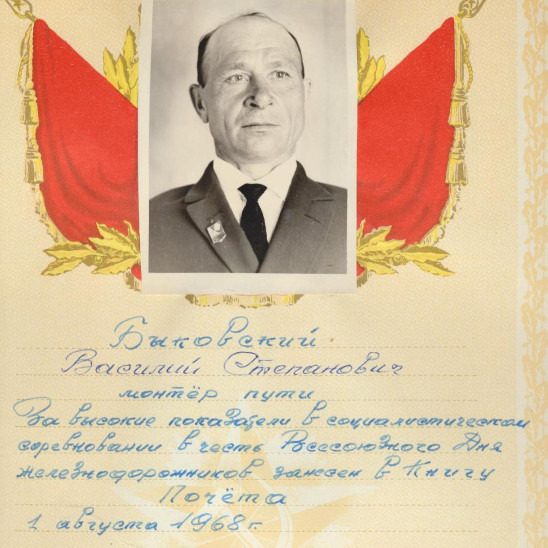После мобилизации с 25.04.1945г. работал в Калачинской дистанции пути путевым обходчиком. За высокие показатели в социалистическом соревновании занесен в Книгу Почета в 1968г. Трудовой железнодорожный стаж 25лет.