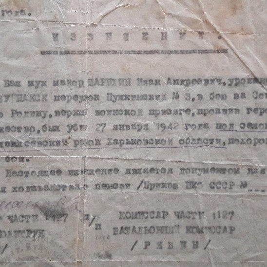 Сведений о моём прадедушке очень мало. До войны он преподавал в военном училище. В начале войны был приван на фронт в звании майора. Был командир миномётного батальёна, 1127 стрелкового полка, 337 стрелковой дивизии. Погиб на поле боя 27 января 1942 года. Дома остались жена и пятеро детей. Старший сын в возрасте 13 лет убежал на фронт мстить за гибель отца.стал сыном полка, ходил в разведку. Помним, гордимся, передаём память следующим поколениям.