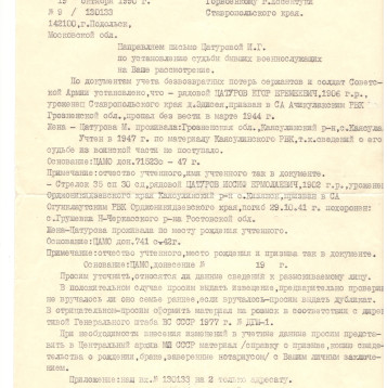 Боевой путь ветерана Мой дедушка - Цатуров Иосиф Еремеевич, в 1941 году был призван на фронт. Дома осталась жена - Цатурова Варвара Константиновна и несовершеннолетний сын - Цатуров Георгий Иосифович ( мой отец ). Освобождая нашу Родину от фашистов, он пал смертью храбрых на полях сражений, в октябре 1941 года. Похоронен в братской могиле, в с. Грушевка Аксайского района Ростовской области.