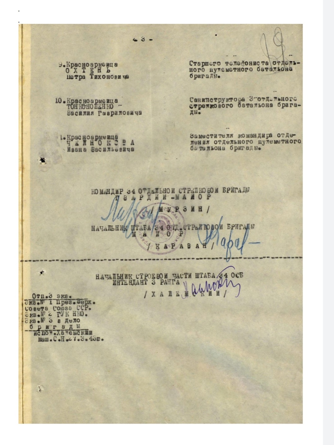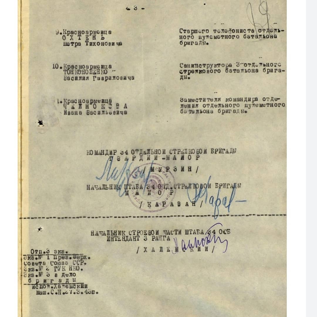 ЧЕЛНОКОВ ИВАН ВАСИЛЬЕВИЧ (1911 - 1971) был призван Кропоткинским РВК, Краснодарского края, Кропоткинского района с 01.02.1943 года (726 стрелковый полк 34 стрелковая бригада). Он был пулемётчиком. За участие во всех боях за Таманский полуостров был награждён Медалью «За отвагу». В бою в районе кирпичного завода и колхоза имени Кагановича Красноармейского района 9 марта 1943 года огнём из своего пулемёта, находясь в должности заместителя командира отделения отдельного пулемётного батальона бригады, подавил огонь 1 пулемётной точки противника, обстреливавшей наши наступающие части с фланга. В этом же бою лично уничтожил 11 вражеских солдат. За этот подвиг был награждён Медалью «За боевые заслуги». Был тяжело ранен, в бою ему перебило обе ноги. Прогноз врачей был неутешителен: «Калека, если вообще будет жить». Из госпиталя на подводе его привезла домой жена Клавдия Матвеевна, которая долго, настойчиво и терпеливо выхаживала Ивана Васильевича. Через боль и муки он встал на ноги, научился ходить и продолжил жить и работать. Прошёл обучение и работал в колхозе «Трудовой путь» учётчиком. Он прожил до 60 лет.