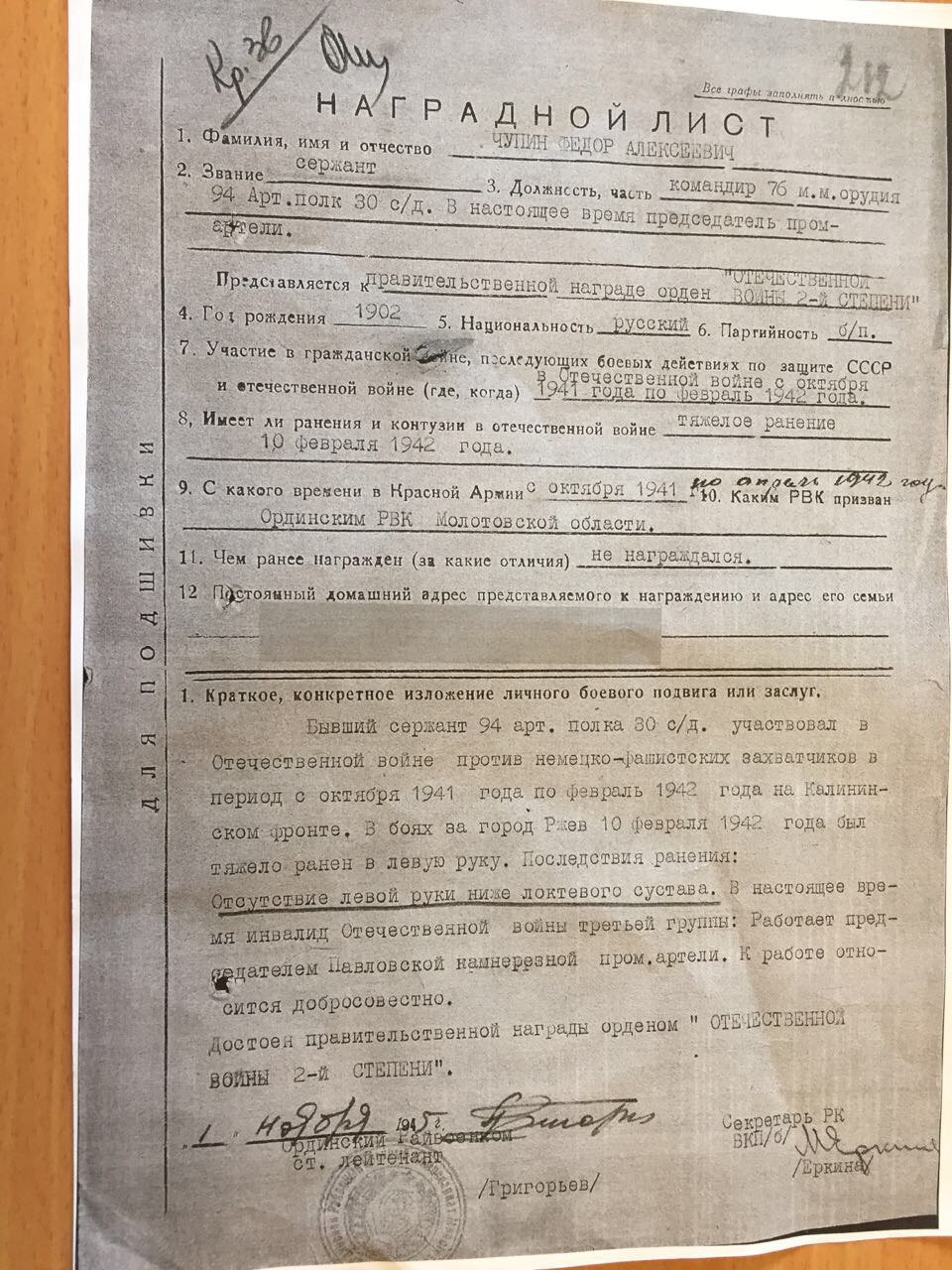 Воевал за Ржев, был тяжело ранен в левую руку, которую в последствии ампутировали, он вернулся домой, после войны работал председателем колхоза, вырастил 9 честных порядочных детей.