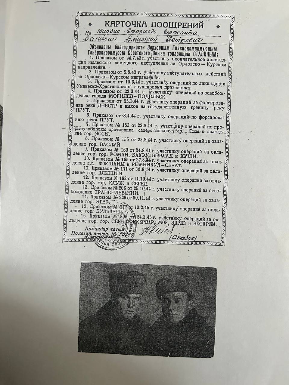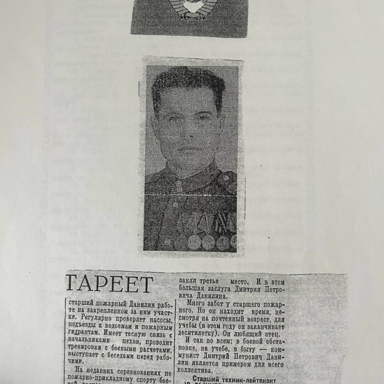 Дмитрий был четвертым ребенком из пяти. Отца он лишился в четырехлетнем возрасте, тот умер от воспаления легких. Без кормильца семье было очень тяжело - они считались бедняками. В деревне Руднево (Тульская область), где они жили, дети могли окончить только начальную школу, а в семилетку надо было ходить за несколько километров. Дмитрий, было, попытался учиться дальше, но через год бросил это дело и стал помогать матери по хозяйству. К тому же, устроился на работу в колхоз, где не гнушался никаким крестьянским трудом. И косил, и свиней пас, и лошадей. А в зиму его оставили конюхом. Тогда многие мальчишки трудились с раннего детства, не до школы было. На их детские плечи рано ложилась ответственность за семью, тем более, если в ней из мужчин были только подростки. Но время шло. Дмитрий повзрослел, и его отправили в Тульское МТС учиться на тракториста. Однако работать в родном колхозе после учебы ему довелось недолго – подошел срок службы в армии. Распределили его в танковую дивизию башенным стрелком и радистом-телеграфистом. По сей день ветеран помнит азбуку Морзе. Служить нравилось. Особенно молодой солдат гордился формой: галифе, танковая курточка, шлем. Да еще под всем этим обмундированием красивое молодое лицо, богатая шевелюра с пышным чубом, высокое стройное тело… И – молодость! Которая не ждала, что совсем скоро на нее обрушится шквал разрывающихся снарядов, гибель ребят, таких же молодых и красивых, и всеобъемлющее горе. Пока же Дмитрий и его сослуживцы ни о чем подобном не думали, добросовестно изучали Морзе и осваивали военную науку. Данилин устроился на работу в пожарную охрану при электростанции. Создал свою семью, поселился в комнате в «доме холостяков». Дни шли своей размеренной чередой. Но наступило 21 июня 1941 г., и вновь рушились мирные планы. Все, кто служил в пожарной части, имели броню. Но когда пришло разрешение отправиться добровольцем на фронт, Данилин не сомневался ни секунды. Не удержало и то, что они с женой ждали первенца. Вместе с ним защищать родную землю ушли и два его товарища – Павел Зинин и Николай Крылов. Последний - не вернулся. Бывший танкист Дмитрий Данилин теперь учится прыгать с парашютом. Сколько было прыжков, разве сосчитаешь. И каждый раз волнение. Но намертво засело в памяти, что на счет «четыре» надо дернуть кольцо, чтобы парашют раскрылся. Готовили состав для отправки к партизанам, чтобы доставить тем оружие и продукты питания. А дальше. Дальше война до победы. В 42-м – бои на Курском направлении. Когда наши пошли в наступление, в день продвигались вперед километров на 50, освобождая город за городом. И Данилин был в ряду бойцов. Сражался на румынской земле, в Венгрии. Попадал в окружение, был контужен, ранен, ходил в разведку, после которой удалось уничтожить 16 вражеских пушек. Тогда всю роту наградили медалями «За отвагу». Но для Дмитрия Петровича нет дороже награды, чем небольшой истертый листок, где гвардии старшему сержанту Данилину, участнику операций за овладение городами объявлено 16 благодарностей от имени Сталина. К этому документу у него особое отношение, хотя не меньшую гордость вызывают и другие ордена и медали: Орден Красной Звезды, две медали «За боевые заслуги». Дивизия, где он служил, была отмечена Орденом Ленина, Орденом Суворова, Орденом Кутузова. Сообщение о победе застало Данилина в Ав