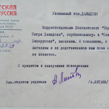 Но Николаю Ивановичу хотелось разыскать ещё и жену Петра Ивановича – Ангелину Иосифовну. И настойчивость увенчалась успехом. Как вспоминал Н.И. Давыдов, об этой истории случайно узнал преподаватель одного из Минских вузов П.М. Кирюшин, который оказался уроженцем с. Починки нашего района и решил помочь землякам. Его стараниями Минское телевидение 6 февраля 1968 года показало фотографию П.И. Давыдова с супругой. И на передачу откликнулась сама Ангелина Иосифовна! Спустя полтора месяца А.И. Давыдова выступила по Минскому телевидению и рассказала о подвиге мужа и своей дальнейшей судьбе. Передачу записали на магнитофонную ленту и выслали в Егорьевский краеведческий музей. Никогда не видевшиеся ранее и почти ничего не знавшие друг о друге родственники стали переписываться. Так Николай Иванович буквально из первых рук узнал о том, как погиб старший брат.