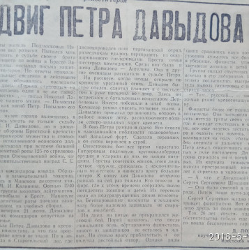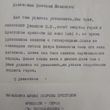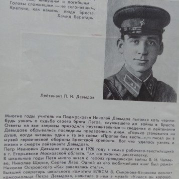 Летом 1967 года Н.И. Давыдов, уже вернувшийся в Егорьевский район и работавший в д. Колычево, с группой педагогов поехал на экскурсию в Брест. Там он обратился в музей за информацией о своём брате. И вдруг выяснилось, что лейтенант П.И. Давыдов значится в списках погибших защитников крепости! Правда, никаких подробностей об этом не имелось. Зато работники музея нашли адрес С.С. Шиканова, который в 1941 году был командиром пулеметной роты 125-го стрелкового полка и являлся прямым воинским начальником Петра Давыдова, а также его товарищем по учёбе в МВУ. Николай Иванович отправил письмо С.С. Шиканову. В ответном послании тот сообщал, что в последние дни перед войной их подразделение находилось в полевом лагере, где проводили стрельбы из станковых пулемётов. Вечером 21 июня, в субботу, лейтенант Давыдов попросил отпустить его до утра домой. Больше друзья-однополчане не виделись: в 4 часа начались бомбёжки и артобстрелы, немцы перешли границу… - Спустя месяц в партизанский отряд, где находился и я, смогли пробраться из Бреста семьи шести командиров, в том числе и жена Петра Ивановича Давыдова – Ангелина Иосифовна, – сообщал в своём письме С.С. Шиканов. – Она рассказала нам, как её муж и другие бойцы с первых минут войны вступили в бой, как держали оборону и погибли. Сама же Ангелина Давыдова активно включилась в партизанское движение, в дальнейшем была переправлена на «большую землю», а затем вернулась на родину – в Минск. Потом следы её затерялись. Казалось бы, Н.И. Давыдов мог завершить свой поиск. Судьба старшего брата выяснилась. Его героическую смерть подтвердило официальное письмо от руководства музея обороны Брестской крепости. О лейтенанте Давыдове рассказали республиканская газета «Советская Белоруссия» и СМИ Егорьевского района…