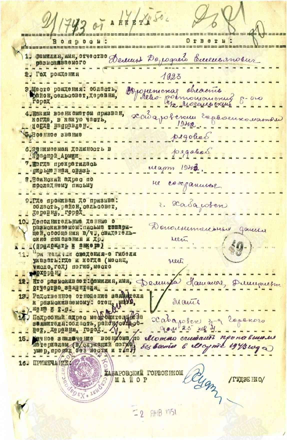 Ушел на фронт добровольцем. Выучился на санинструктора и сразу попал в пекло Сталинградской битвы. В марте 1943 г. его мать получила известие, что сын пропал без вести. Вот и весь жизненный путь молодого парня.