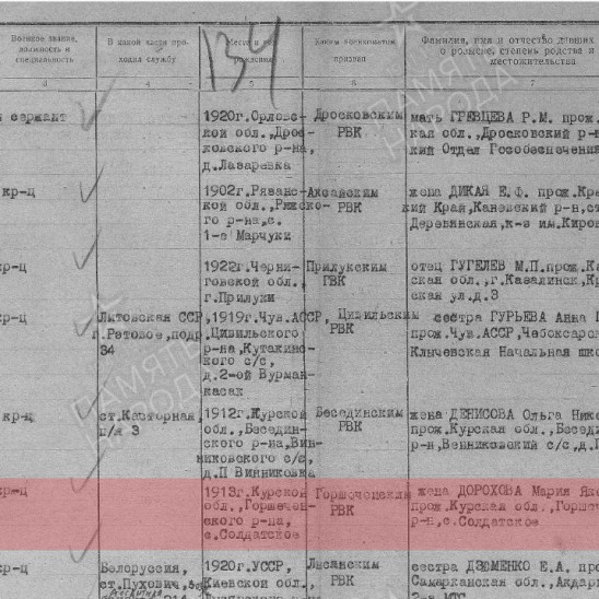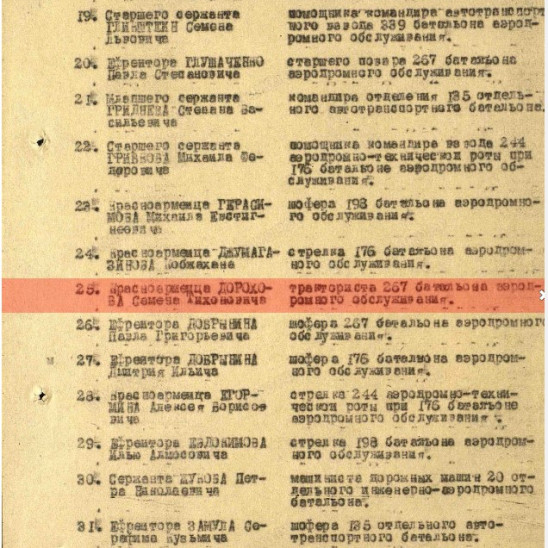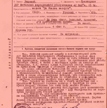 Наименование военкомата: Курский ОВК, Курская обл. Дата и место призыва: Курский ОВК, Курская обл. Дата поступления на службу: __.__.1941. Воинское звание: красноармеец. Воинская часть: 42 РАБ. Наименование награды: Медаль «За боевые заслуги». Кто наградил: 15 воздушная армия. Приказ подразделения. №: 22/н от: 30.04.1944. Издан: ВС 15 ВА. Информация об архиве: Архив: ЦАМО. Фонд ист. информации: 33. Опись ист. информации: 686044. Дело ист. информации: 4120. Наименование награды: Орден Отечественной войны II степени. Номер документа: 74. Дата документа: 06.04.1985. Информация об архиве - Архив: ЦАМО. Картотека: Юбилейная картотека награждений. Расположение документа: шкаф 15, ящик 20. Какое-то время Дорохов Семён считался без вести пропавшим, но он вернулся и побывал ещё на советско-японской войне. Вернулся домой в 1946 году.