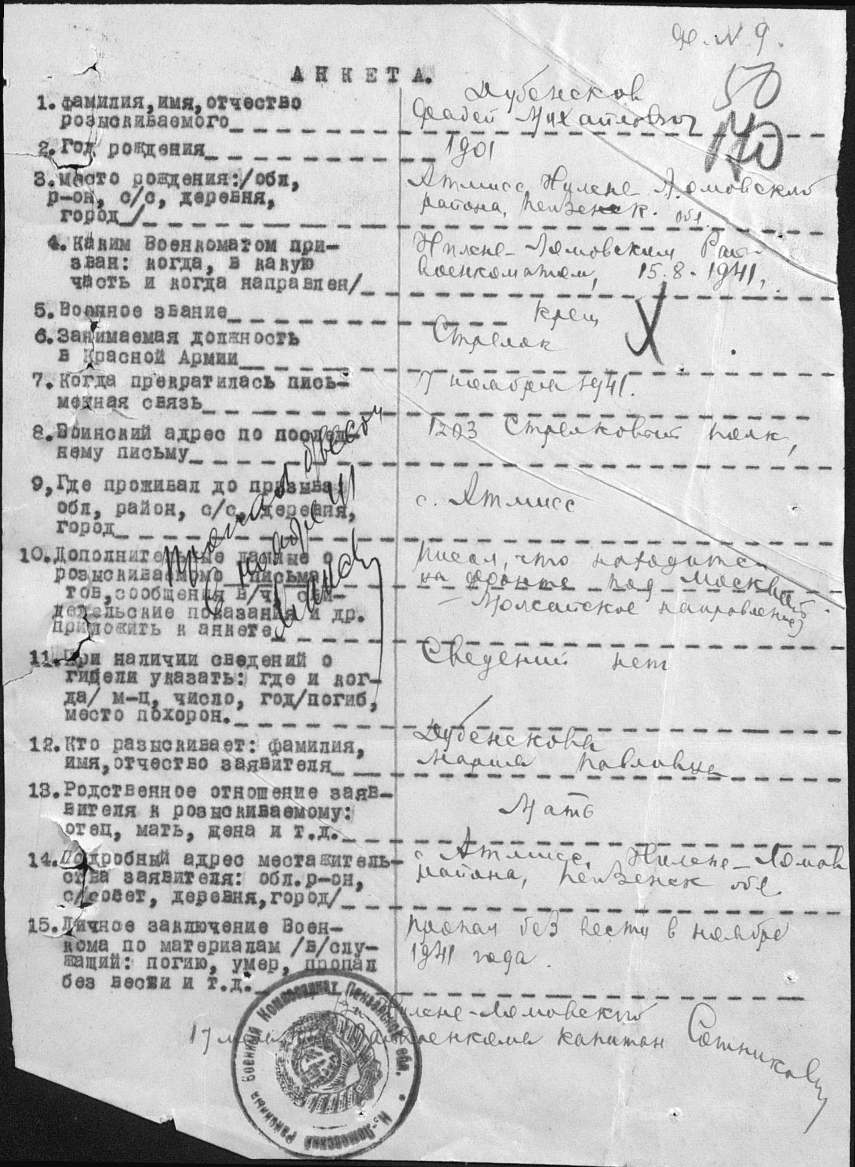 Ещё не кончилась война. Ещё ребячьи батальоны Находят павших имена На поле битвы в медальонах… Е. Гришин Глава 1 Прапрадед Судьба моего прапрадеда, Дубенскова Фадея Михайловича схожа с судьбами еще 6-ти наших земляков: все призывались примерно в одно и тоже время – в августе 1941 года, и у всех в графе «дата и место гибели» стоит одно и то же: «пропал без вести 00.11.1941».(приложение 1) Да и биография его связана со всеми окрёстными сёлами: Дубенсков Фадей Михайлович родился в 1901 году в селе Атмис Нижнеломовского района. Его мать, Мария Павловна, уроженка села Большой Мичкас. А вот жена, кстати, тоже Мария, уроженка поселка Красный, родственники её до сих пор проживают в селе Вирга. Рос в большой крестьянской семье, трудился с ранних лет, сначала ухаживая за скотиной, потом работал с взрослыми в поле. Так и пролетели годы… Сначала грянула Первая мировая война, затем - революция. В 1920 году, во время гражданской войны, Фадей Михайлович был призван в ряды Красной Армии. Воевал в составе легендарной 1-ой Конной армии. После завершения гражданской войны вернулся в родное село. Вскоре женился. Один за другим родилось трое сыновей – Алексей, Александр и Василий. Казалось бы, живи да радуйся – семья большая, крепкая, растут трое помощников. Но радоваться долго не пришлось. 22 июня 1941 года началась война. Уходили на фронт односельчане, друзья, соседи. Вскоре повестку получил и Фадей. Как рассказывали родственники, от него пришло лишь два письма (к сожалению, письма не сохранились). В последнем письме он писал, что его часть перебрасывают в Москву, и скоро в бой. [1] Письмо, как нам удалось установить, датировалось 7 ноября. А после – тишина. Всю войну прождала семья Фадея Михайловича, но так и не дождалась. В 1945 году умерла жена – Мария. В 1947 году умерла мать – Мария Павловна. Трое сыновей, старшему из которых, Алексею, едва исполнилось 15 лет, остались сиротами (отец Фадея, Михаил, умер ещё в 30-е годы). Спасибо, помогли дальние родственники, которые не дали умереть с голоду и приютили ребят у себя. В общем, некому, да и некогда в тяжёлое послевоенное время было разыскивать пропавшего солдата. Собрав необходимую информацию, мы с папой приступили к работе по поиску сведений о прапрадедушке. Но, как оказалось, не так-то просто это было сделать. Начали мы свою работу с изучения архивных данных по сайтам обобщённого банка данных (ОБД) Мемориал и Солдат. ру, а также Книг Памяти Пензенской области (они выходили в нескольких редакциях)(приложение 2). Но детальное изучение сведений результатов не дало. Кроме записи о месте службы – Последнее место службы -1203 СП 354 СД. Как оказалось, это 1203 стрелковый полк 354-ой стрелковой дивизии, которая формировалась в конце лета 1941 года на территории Пензенской области. Вполне очевидно, что многие наши земляки, призывавшиеся в армию с августа по сентябрь-октябрь, могли попасть именно в эту дивизию. Обращение в Нижнеломовский военкомат это подтверждает. Оказывается, Мария Павловна все же пыталась разыскать сына. Анкета-запрос датируется 8 июня 1946 года, незадолго до её смерти. Из анкеты следует, что красноармеец Дубенсков был призван 15 августа 1941 года Нижнеломовским РВК и направлен под Кузнецк Пензенской области, где шло формирование 1203 стрелкового полка . [2] Поиски я решила начать с сайтов, где в настоящее время собран большой материал об участни