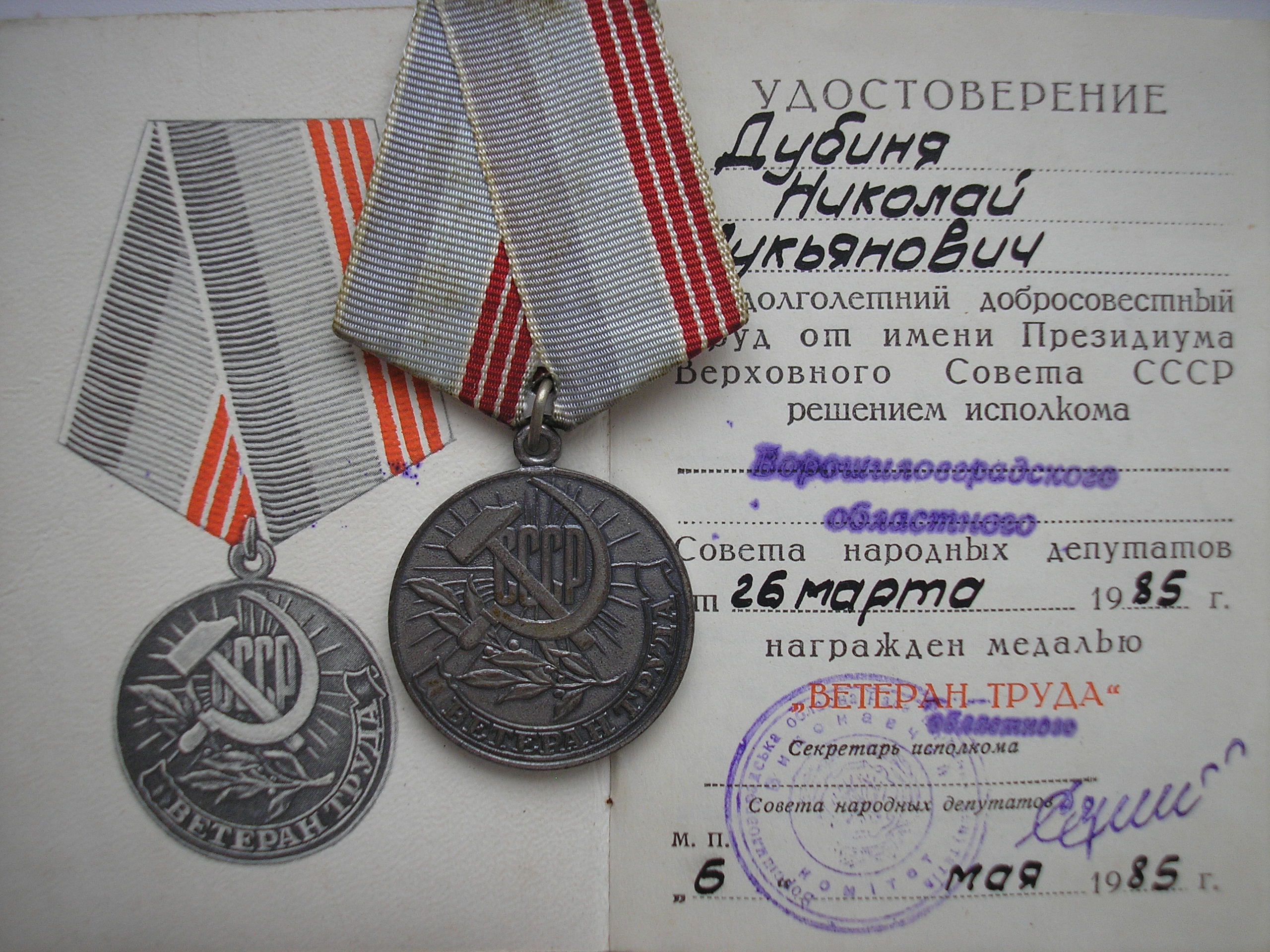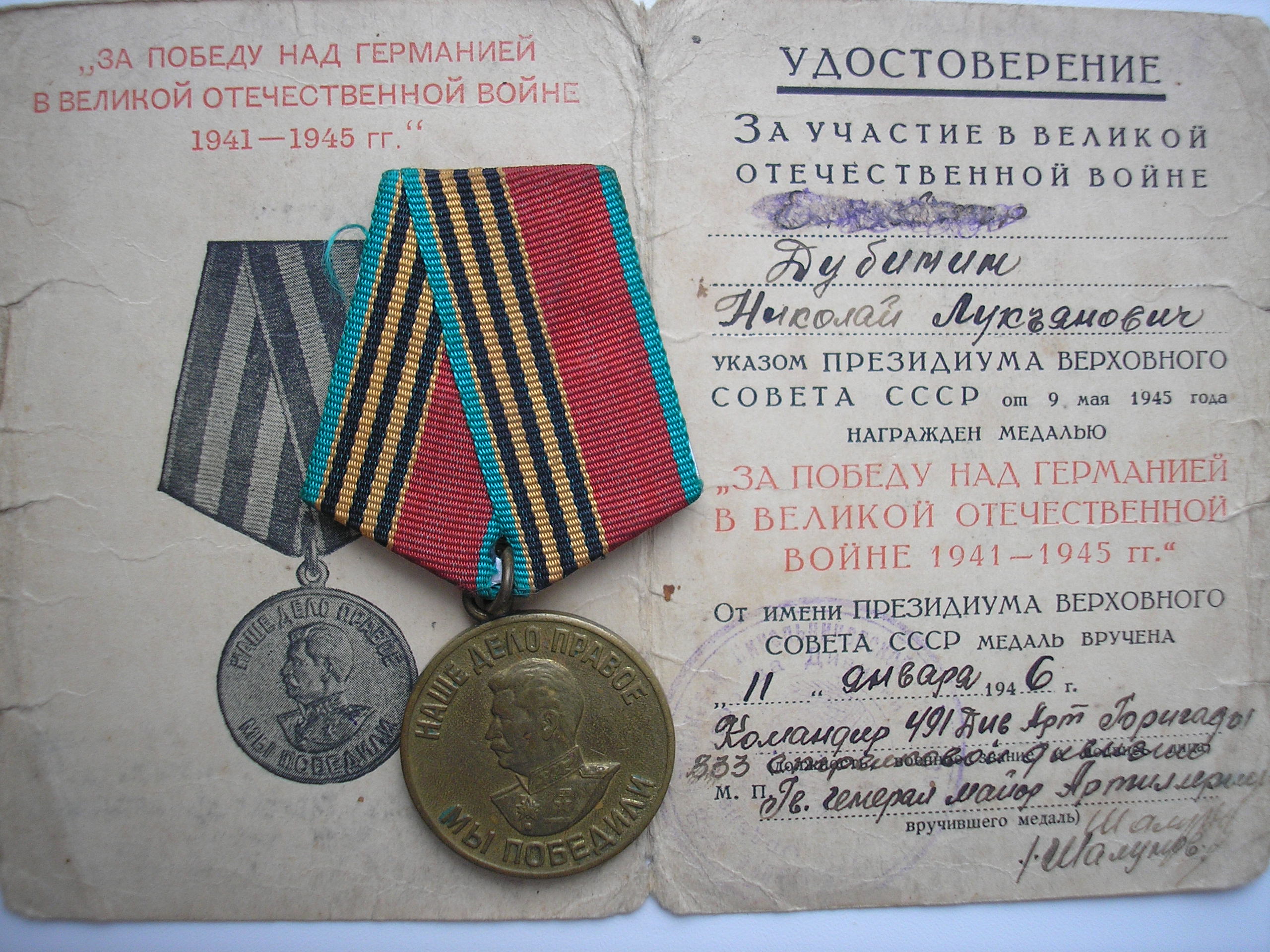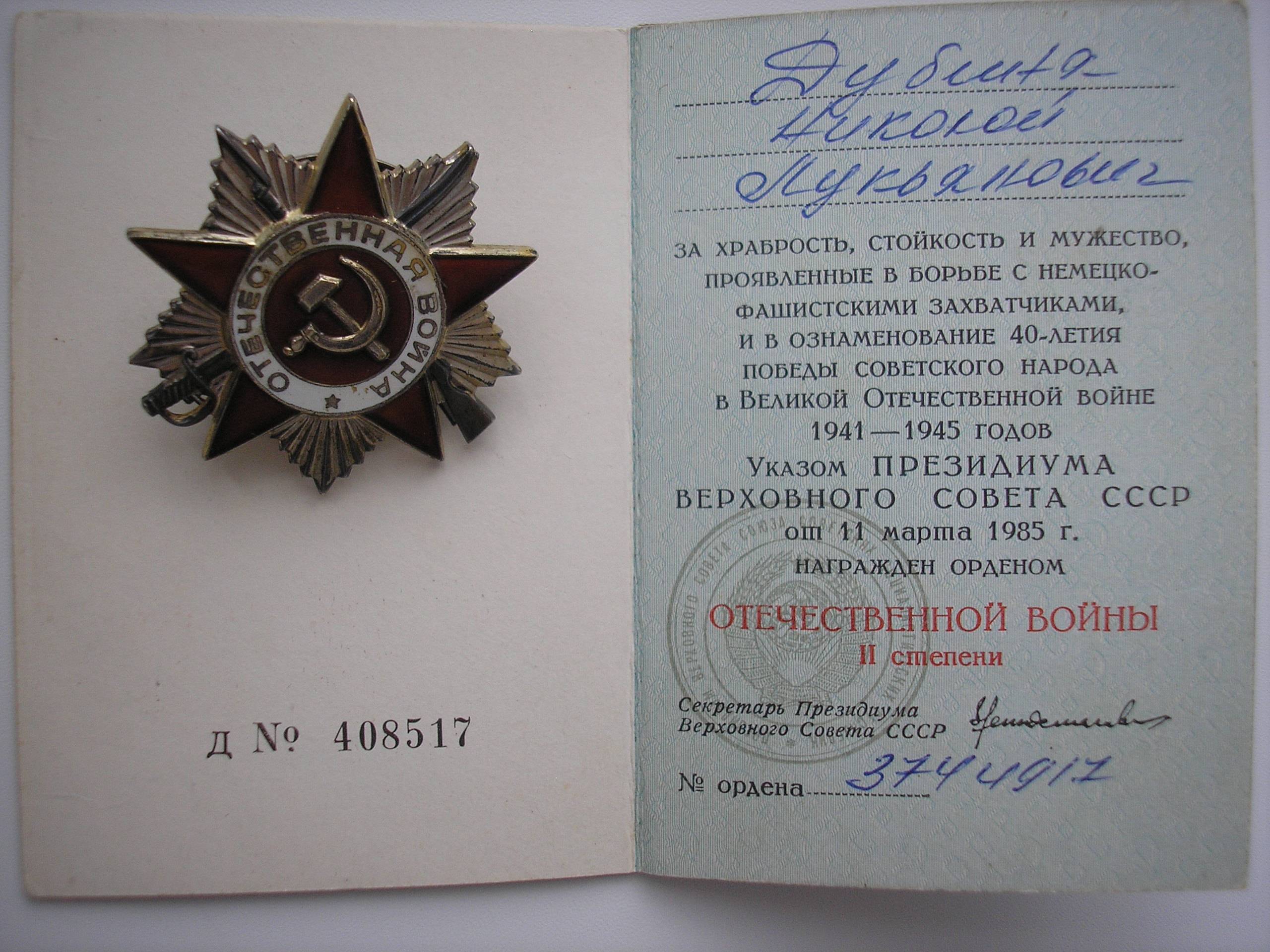 ДУБИНЯ Николай Лукьянович(св-во о рождении, паспорт), с 1943-по 1945гг. по всем военным документам числился, как ДУБИНИН Николай Лукьянович - Герой Великой Отечественной Войны. В 1942года война была в самом разгаре, на тот момент ему было 17 лет, но так, как хотелось побыстрее пойти в Красную армию, попасть на фронт,встать на защиту нашей Родины, решил приписать себе год. По документам в Красной армии с 18.02.1943г. На фронт попал в сентябре 1943г., был снайпером, воевал на Южном фронте. Учавствовал в боях в прорыве сильно укрепленной обороны противника на реке Молочная в составе 13 гв. мех. бригады 4-го Сталинградского мех. корпуса, ворвавшись в немецкие траншеи, уничтожил огнем автомата и гранатами 12 немецких солдат. В составе 1275 стрелкового полка, находясь в обороне на Перекопском перешейке, будучи снайпером, уничтожил 14 немецких солдат(подтверждение снайперская книжка). В боях при прорыве сильно укрепленной обороны на Перекопском перешейке, при взятии первых траншей противника, где противник перешел в контр атаку, отражая 6 контр атак, уничтожив до 20-ти немецких солдат, получив ранение (02.12.1943) не покидая поле боя, продолжал отбивать контр атаки противника. 8.04.1944 при ликвидации Шемиловской группировки отражая контр атаки противника уничтожил 5 немцев и подавил огонь 2-х пулеметных точек противника. 11.04.1944г приказом, была объявлена благодарность Верховным Главнокомандующим Маршалом Советского Союза товарищем Сталиным "За отличные боевые действия при прорыве укрепленной обороны противника на Перекопском перешейке". 09.05.1944г. в уличных боях г. Севастополя уничтожил до 8-ми румын. 10.05.1944г приказом была объявлена благодарность Верховным Главнокомандующим Маршалом Советского Союза товарищем Сталиным "За отличные боевые действия по прорыву сильно укрепленной долговременной обороны немцев, состоящей из трех железобетонных оборонительных сооружений и овладение крепостью и важнейшей военно-морской базой на Черном море-городом Севастополь". Был и в плену, из которого ему удалось сбежать и встать опять на защиту нашей Родины. Победу встретил на фронте в Болгарии, в звании ефрейтор. Награды: Орден "Славы III степени" (1944г.), Орден "Отечественной войны II степени"(1985г.), Орден "За Мужество II степени"(1999г., был награжден этим орденом по Указу Президента Украины, т.к. в 1945г должен был получить орден "Красной Звезды", но не получил его из-за бюрократии), медаль "За Отвагу"(1944г.), медаль "За Победу над Германией в Великой Отечественной Войне 1941-1945гг"(1945г.) Это был наш дедушка и папа. Помним, Любим и Гордимся. ТЫ НАШ ГЕРОЙ И ПОБЕДИТЕЛЬ!!!