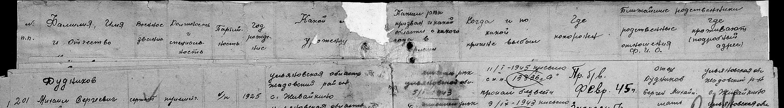 Призван на службу 5 января 1943 года Барышским РВК Ульяновской области. Пропал без вести в январе-февраля 1945 года.