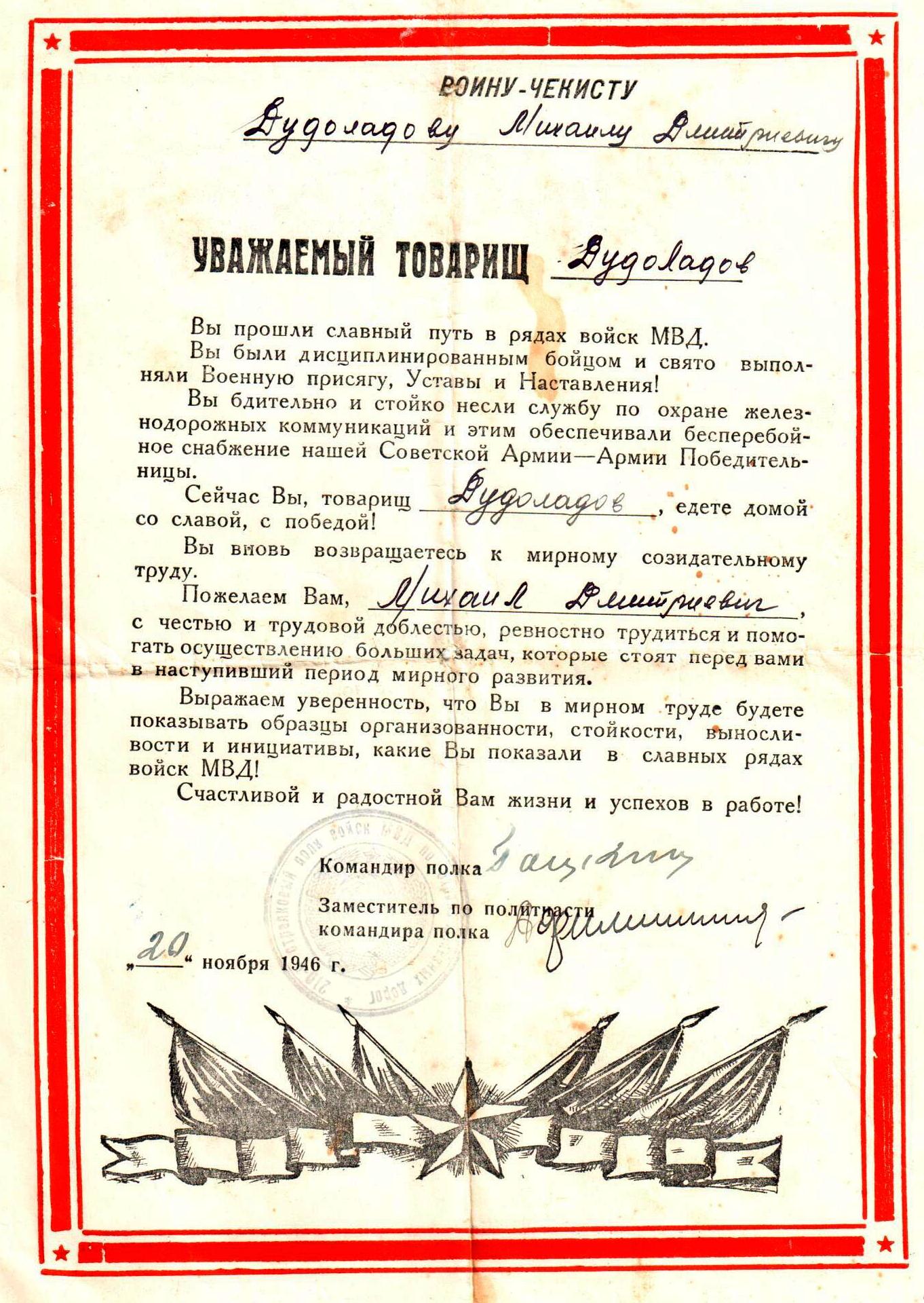 полку НКВД-шофёр.С сентября 1945 года по октябрь 1946 года -210 полк