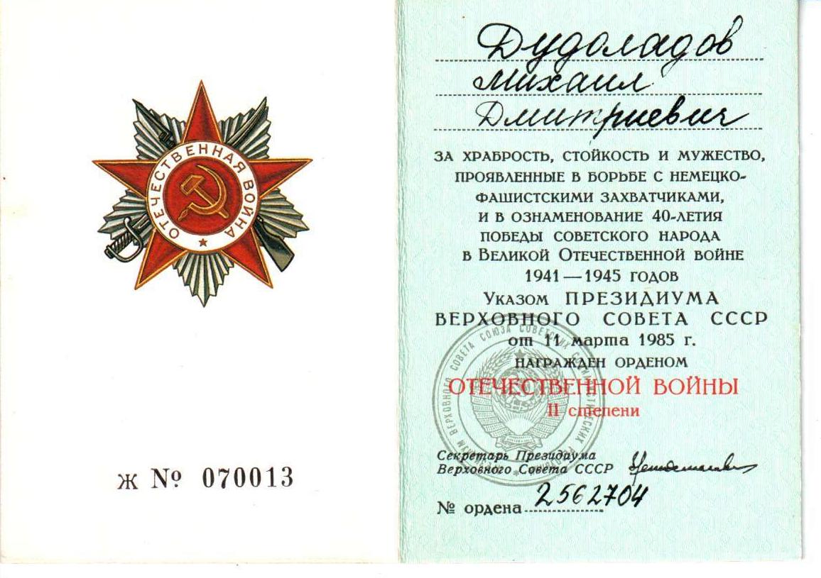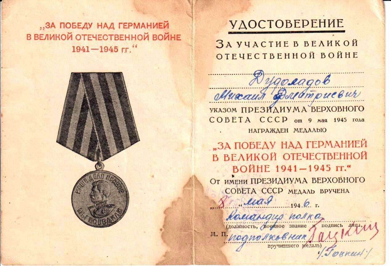 марта 1946 года.Ранений и контузий в период ВОВ не имел.Правительственные награды:-Медаль «За победу над Германией в ВОВ 1941-1945 г.г.»
