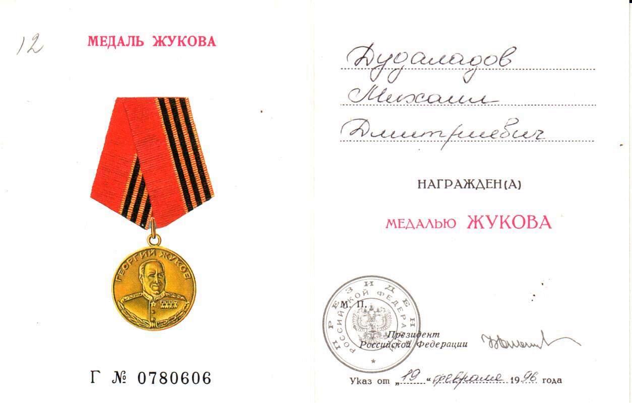 от 08 мая 1946 года,- «Орден Отечественной войны II степени» от 11 марта 1985 года,-«Медаль Жукова» от 19 февраля 1996 года.