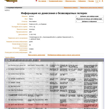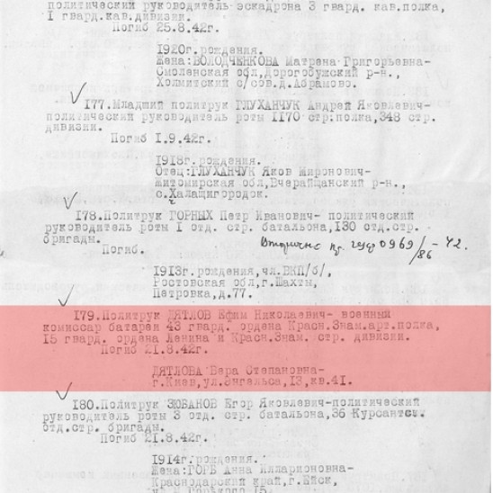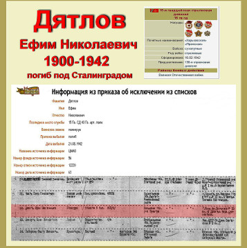 Мой двоюродный дед по матери, ст.лейтенант, Дятлов Ефим Николаевич. Родился в г. Бровары Киевской области. До войны проживал с семьёй на улице Лютеранской в Киеве. С началом Великой Отечественной войны служил политруком, военным комиссаром батареи 43 гвардейской, ордена Красного Знамени, артиллерийского полка, 15 гвардейской, ордена Ленина и Красного Знамени, стрелковой дивизии. Погиб в августе 1942 года в ходе оборонительного сражения Сталинградской битвы на рубежах совхоза Приволжский у села Дубовый Овраг, в 30 км от Сталинграда. Похоронен в братской могиле в этом селе. Малолетний сын его пропал без вести при эвакуации. Все данные обнаружены мною на сайте "Мемориал" в 2015году. Фотографии утеряны.