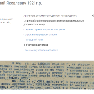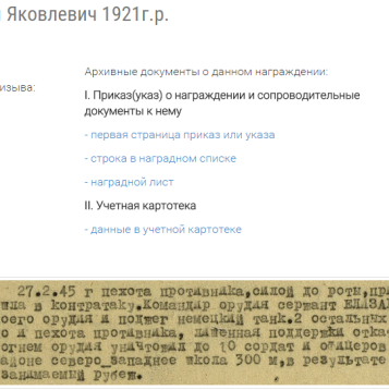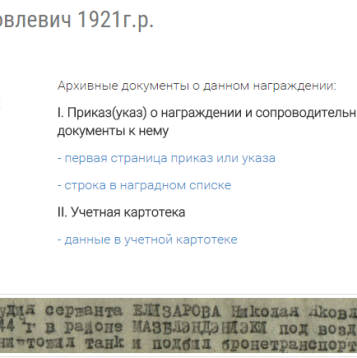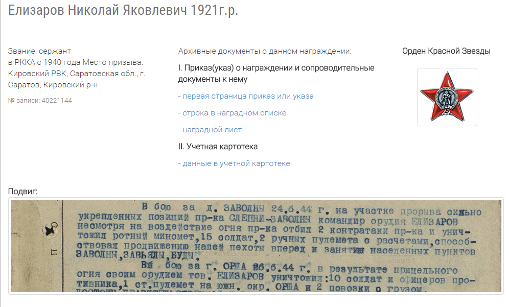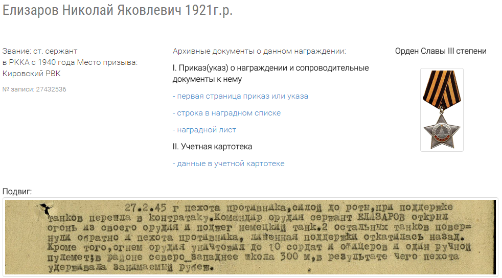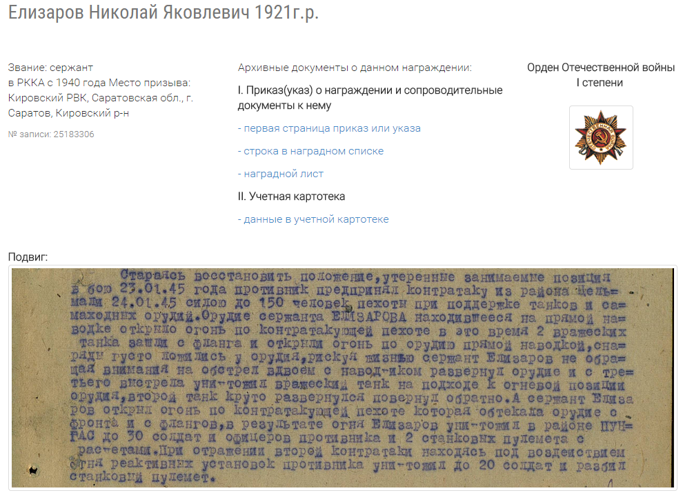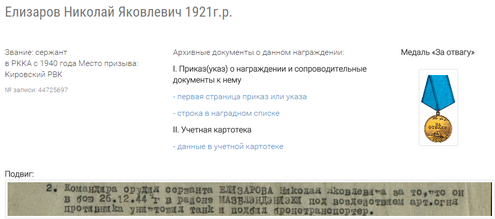 о награждении: «Сержант Елизаров находясь на прямой наводке, несмотря на явное