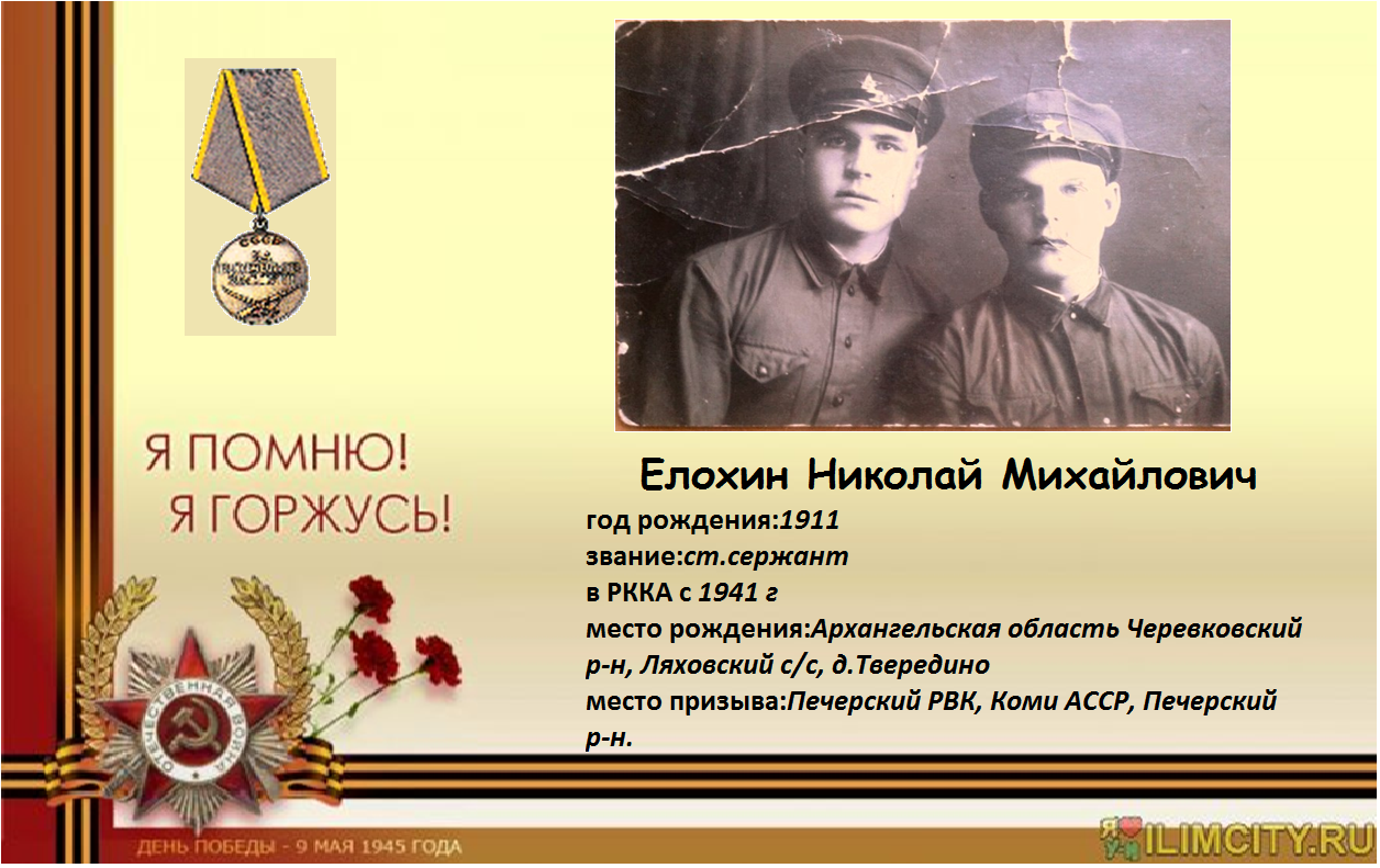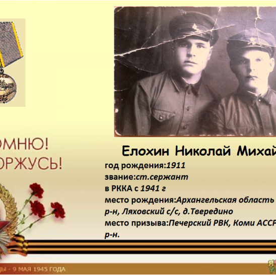 Боевой путь ветерана Мой дедушка слева. Дочь Елохина Емма Николаевна (моя мама) год рождения 1942, Дочь Елохина Галина Николаевна, Сын Елохин Эдуард Николаевич, Внучка Угловская Екатерина Юрьевна 1986, Правнучка Угловская Юлия Евгеньевна 2011