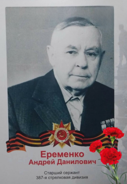 Они не услышат наше СПАСИБО, они не увидят наш НИЗКИЙ ПОКЛОН. Но ПАМЯТЬ в наших сердцах ВЕЧНО ЖИВА. Мы стараемся передать нашим детям внукам, чтобы ПОМНИЛИ ЦЕНУ ПОБЕДЫ ИХ ПРАДЕДА И ДЕДА. Мой дед ЕРЕМЕНКО АНДРЕЙ ДАНИЛОВИЧ в первом ряду первый слева. Деда военная биография началась с августа 1941 года 387 стрелковая дивизия. Оборонял Курск, Сталинград, освобождал Ростов, Донбасс, Севастополь. Дважды подрывался на минах. Имел ранения, контузии. Награжден орденом ОТЕЧЕСТВЕННОЙ ВОЙНЫ 1 СТЕПЕНИ, медаль "За ОТВАГУ", "ЗА БОЕВЫЕ ЗАСЛУГИ", ЗА ОБОРОНУ СТАЛИНГРАДА, ЗА ПОБЕДУ НАД ГЕРМАНИЕЙ, ЗА ПОБЕДУ НАД ЯПОНИЕЙ и другими наградами.