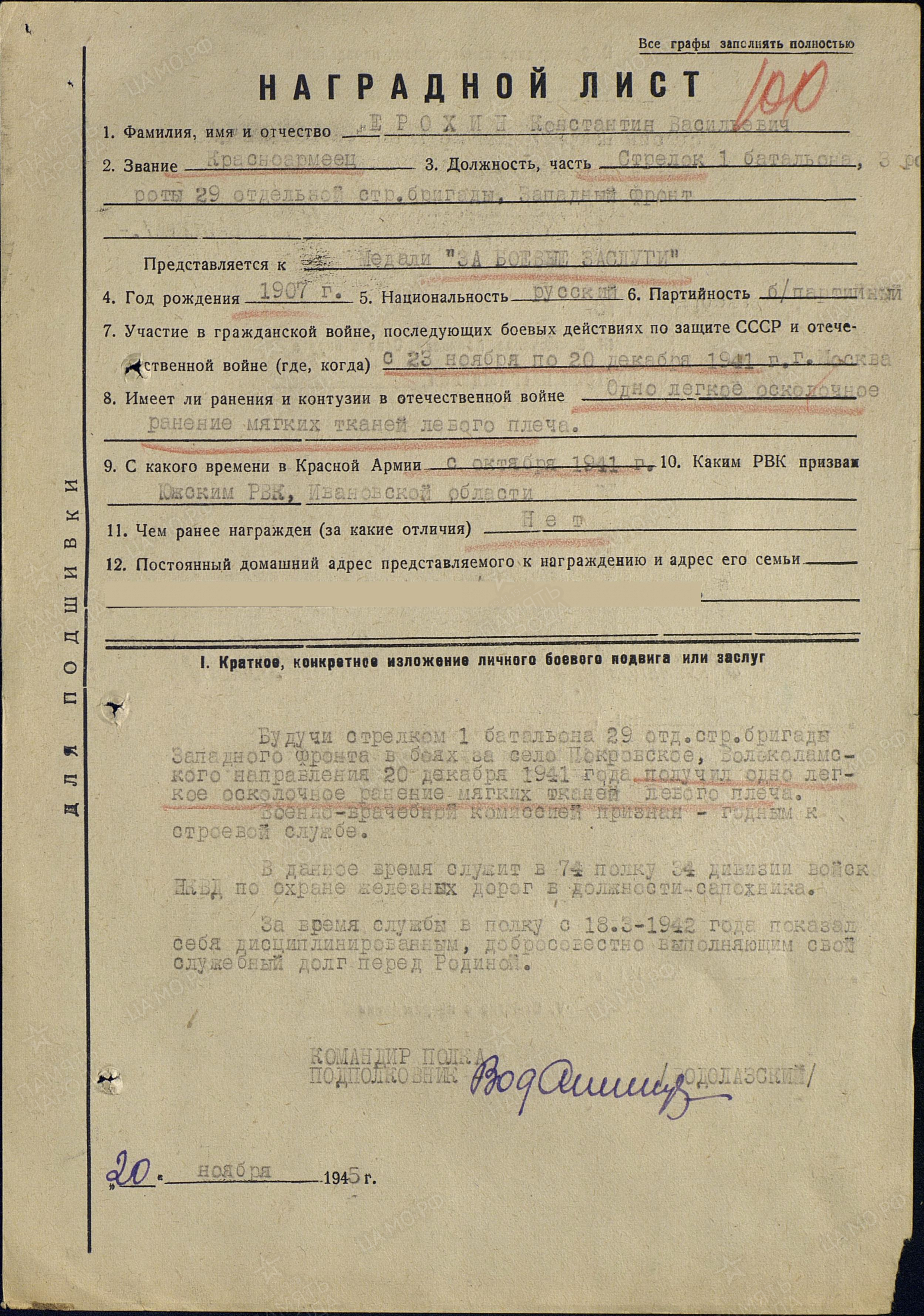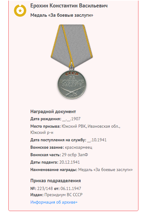 Для нашей семьи день 9 Мая - важная дата. Оба моих прапрадедушки были участниками войны, смогли вернуться с фронта и помогали нашей стране восстанавливаться. В этом году я вместе с родителями приму участие в акции «Бессмертный полк» , мы так сможем почтить их память. Многие мои друзья тоже в ней будут участвовать. В нашей школе ученики всех классов вместе с учителями подготовили Стену памяти. Каждый день, проходя мимо нее, мы думали о тех, кого никогда не видели, но так благодарны им за их подвиг и все то, что они смогли сделать для нас. О прапрадедушках мне рассказала моя бабушка и конечно информация с сайта «Мемориал памяти». На акцию «Бессмертный полк» я пойду с портретом моего прадеда Ерохина Константина Васильевича, который был призван на фронт в октябре 1941 года Южским РВК Ивановской области. Мой прадедушка Ерохин Константин Васильевич был красноармейцем и стрелком 1 батальона 29 отдельной стрелковой бригады Западного фронта. На Западном фронте к 17 декабря закончился первый этап контрнаступления Красной Армии под Москвой. За десять дней советские войска разбили ударные группировки врага, наступавшие на столицу. Началась Калужская наступательная операция войск левого крыла Западного фронта. В боях за село Покровское Волоколамского направления 20 декабря 1941 года мой прадедушка получил одно лёгкое осколочное ранение мягких тканей левого плеча. За участие в этом бою он был награждён медалью «За боевые заслуги». После выписки ,был признан годным к военной службе и до ноября 1945 года служил в 74 полку 34 дивизии войск НКВД по охране железных дорог в должности – сапожника. Всем известно , что без еды человек может обойтись несколько дней, без обуви - нет. Если ступня изранена теряешь возможность быстро реагировать на изменяющиеся обстоятельства . Перебегать , вскакивать , падать и шансы выжить в бою катастрофически уменьшаются . И не случайно в 1943 году появилась " Песня фронтового сапожника" Сидит без ремня, без пилотки, орудует в поте лица В коленях - сапог на колодке, другой - на ноге у бойца."После войны , до самой пенсии, работал в сапожной мастерской на Южском комбинате бытового обслуживания населения (КБО). Приносил радость людям уже в мирное время. Умер в 1991 году.