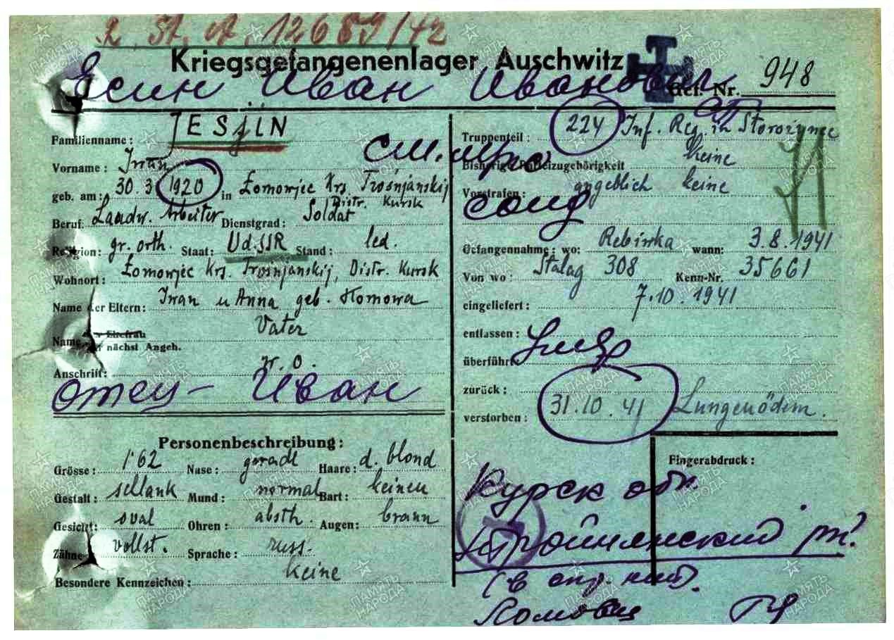 В довоенное время Есин Иван Иванович занимался сельским хозяйством в колхозе им. "Будённого" Орловской (Курской) обл., Троснянского р-на. По имеющимся сведениям, которые находятся в ЦАМО Есин Иван Иванович, был пленён. Дата пленения - 03.08.1941 года. Место пленения - село Репьевка, Воронежская область. Находился в лагере - шталаг VIII E (308). Лагерный номер его - 35661. Причина выбытия - погиб в плену. Место захоронения - Аушвитц (Освенцим).