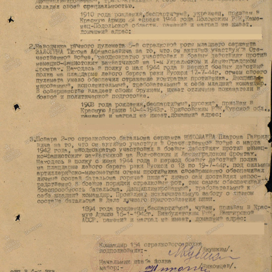 Дата рождения __.__.1910, Место рождения -Чувашская АССР, Чкаловский р-н, д. Ч.-Сугуты, Место призыва -Чкаловский РВК, Чувашская АССР, Чкаловский р-н, Воинская часть 154 сп 327 сд ЛенФ, Дата поступления на службу 28.08.1941.