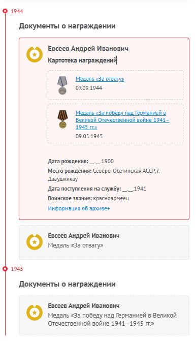 Евсеев Андрей Иванович (14.10.1900-15.12.1975) Родился 14 октября 1900 года в Северо-Осетинской АССР, г. Дзауджикау (ныне г.Владикавказ). До революции жили хорошо: были свои стада коров, лошадей, всякой живности. Имел 13 братьев и сестер. К сожалению, некоторые умерли от заболеваний в детском возрасте, кто-то не пережил голод 1932-1933 годов, а на войну с дедушкой Андреем ушли его 7 братьев. 28.09.1941 годы был призван в Северо-Осетинской АССР, г. Орджоникидзе. Место службы: 1382сп 87 стрелковая дивизия 55СК 2Гв.А 4УкрФ, Орджоникидзевский РВК, Северо-Осетинская АССР. На момент призыва было 4-ро детей, работал слесарем, беспартийный. Рядовым Красноармейцем в составе 1382 стрелкового полка 87 СД 55го стрелкового корпуса 2 Гвардейской Армии 4 УкрФ прошел всю войну до Европы, домой вернулся в 1947 году после восстановления Европейских городов. Из крупных сражений, изменивших ход войны, участвовал: - в августе 1942 году в Битве под Сталинградом. Оборона советских войск. 12.7-18.11.42 г., - в конце августа 1943 г. участвовал в операции по Освобождению Донбасса (18.8-22.9.43 г.), - в октябре 1943 в Мелитопольской операции (прорыв на р. Молочная 26.9-5.11.43 г.), - в августе 1944г. в Шауляйской наступательной операции и отражении контрударов противника в районах западнее и северо-западнее Шауляй. 17.7-28.8.44 г. (Операция 5-го удара). За время войны бабушке приходило 2 похоронки в январе 42 как о погибшем в боевых действиях под Сталинградом и в августе 1944 как о пропавшем без вести в Латвийской ССР, Гольби, в районе Шауляй. В третий раз бабушка оплакивала мужа в 1945, когда дедушка не вернулся после Победы. История умалчивает по каким причинам не сообщал о своем местоположении и состоянии, но домой дедушка вернулся в 1947 году после восстановления Европы и прожил до 15 декабря 1975 года. Награжден 09.05.1945 г. Медалью «За победу над Германией в Великой Отечественной войне 1941–1945 гг.» и 07.09.1944 г. Медалью «За отвагу» Любим, гордимся!
