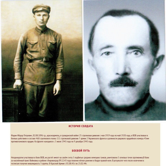 Боевой путь ветерана Мой прадед по линии отца, Фадин Фёдор Петрович. Родился 2.08.1986 года, красноармеец, в гражданской войне 25 стрелковая дивизия с мая 1919 года по май 1920 года, в ВОВ участвовал в боевых действиях в составе 468 стрелкового полка 111 стрелковой дивизии 7 армии 2 Украинского фронта в далжности рядового орудийного номера 45мм противотанкового орудия. На фронте находился с 3 июля 1943 года по 9 декабря 1943 года. Неоднократно участвовал в боях ВОВ, имеет на своём счету 5 подбитых немецких танков, уничтожил 5 огневых точек противника. В боях за населённый пункт Войновка в г. Кировоград 9.12.1943 года получил тяжёлое ранение в бедро правой ноги. В результате чего после излечения в госпитале комиссован, получил инвалидность 3 группы.