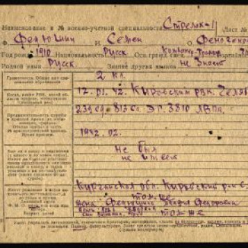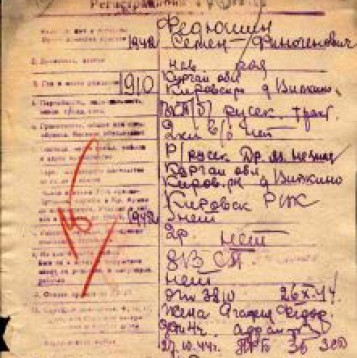 Фадюшин Семён Анфиногенович родился 14 февраля 1910 года в селе Вилкино Юргамышского района Курганской области в семье Анфиногена Федоровича и Юлии Петровны. Был женат на Агафье Федоровне (1906 гр). Работал в колхозе комбайнером-трактористом. До войны в семье Агафии и Семёна родилась дочь Евдокия, сыновья Вениамин, Анатолий и Юрий. 12 января 1942 года был призван на войну. С 1942 по 1944 гг. воевал на Волховском, Ленинградском, 1 и 2 Белорусском фронтах, был тяжело ранен в 1944 году и комиссован по ранению. Вернулся домой в село Вилкино после ранения в 1944 году. Работал в колхозе комбайнёром-трактористом. С весны занимался посадкой и обработкой кукурузы, силосованием кормов. Зимой готовил технику к сезону. За хорошую работу и добросовестный труд награждён медалью к 100-летию рождения Ленина, знаком Ударник коммунистического труда. После войны в семье Фадюшиных Агафьи и Семёна родились ещё 2 детей - сын Виктор и дочь Нина(всего 6 детей). Отец учил ребят заготавливать сено и дрова. Вместе с сыновьями построили дом, держали хозяйство. Выросли парни настоящими мужчинами. Воспоминания дочери Нины: “ Утром мама(Агафья Федоровна) приготовит вкусный обед, папа (Семён Анфиногенович) положит в сумку, да ещё молочко и хлеб, садится на велосипед, сумку через плечо и едет на работу. А вечером вернётся, зовёт нас “Возьмите девчонки хлеб, зайчик гостинец передал”. Летом ягоды собирал, осенью грибы. По выходным топили баню, проводили время всей семьёй, разговаривали про работу в колхозе. Очень добрым и аккуратным был. Любил читать, но правда медленно. В сельской библиотеке брал большие книги про историю. За любой работой, напевал песни, и до самых последних дней на велосипеде ездил…” В 1970 году пошел на заслуженную пенсию, но продолжал работать сторожем до 1980 года. Умер 12 апреля 1986 года. Похоронен на малой родине в селе Вилкино.