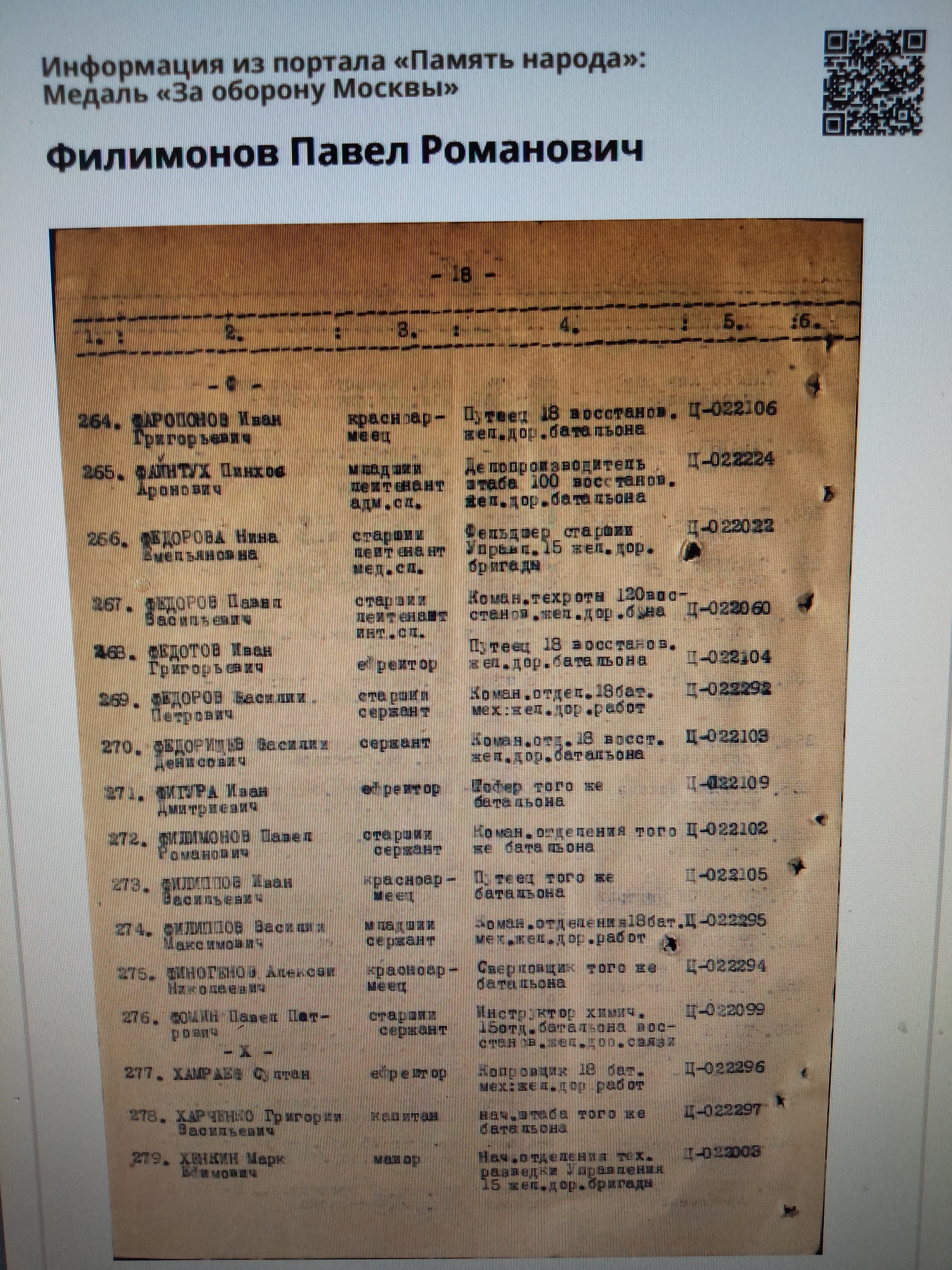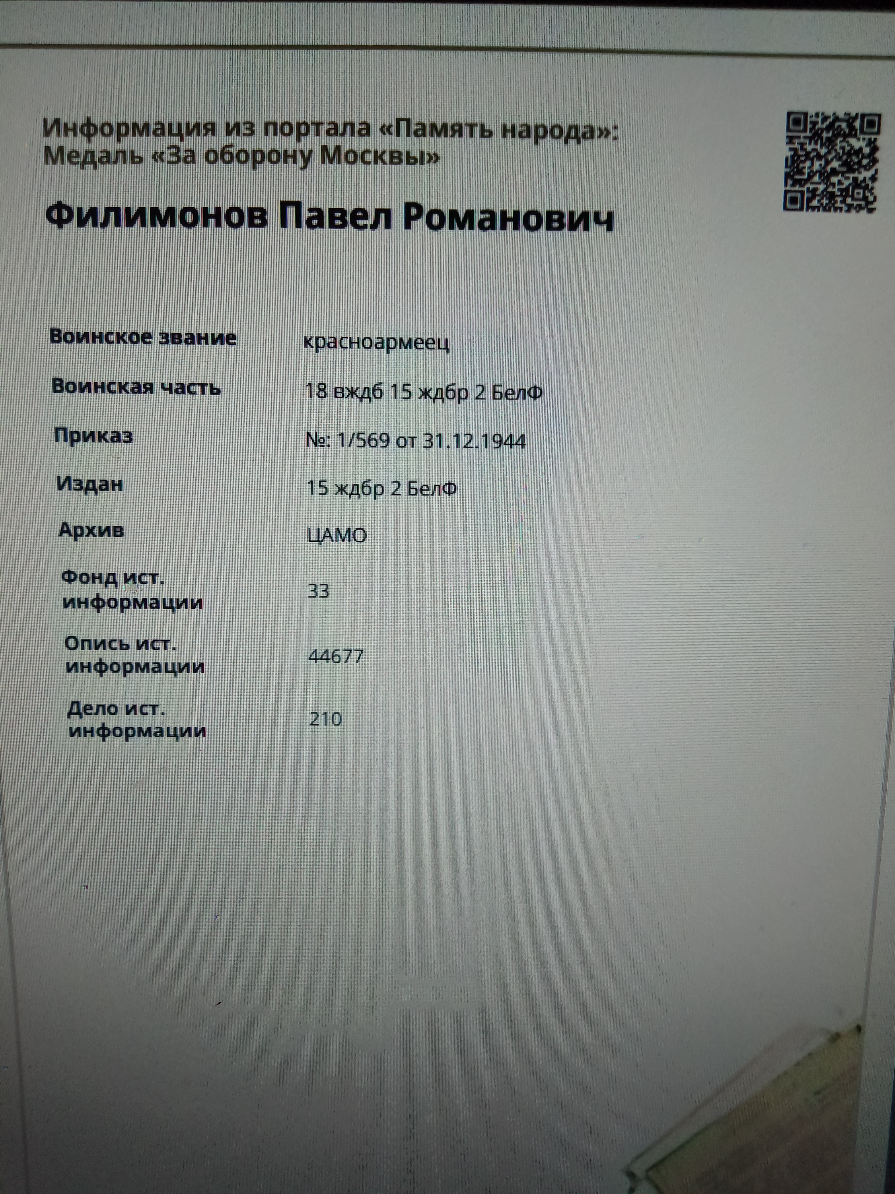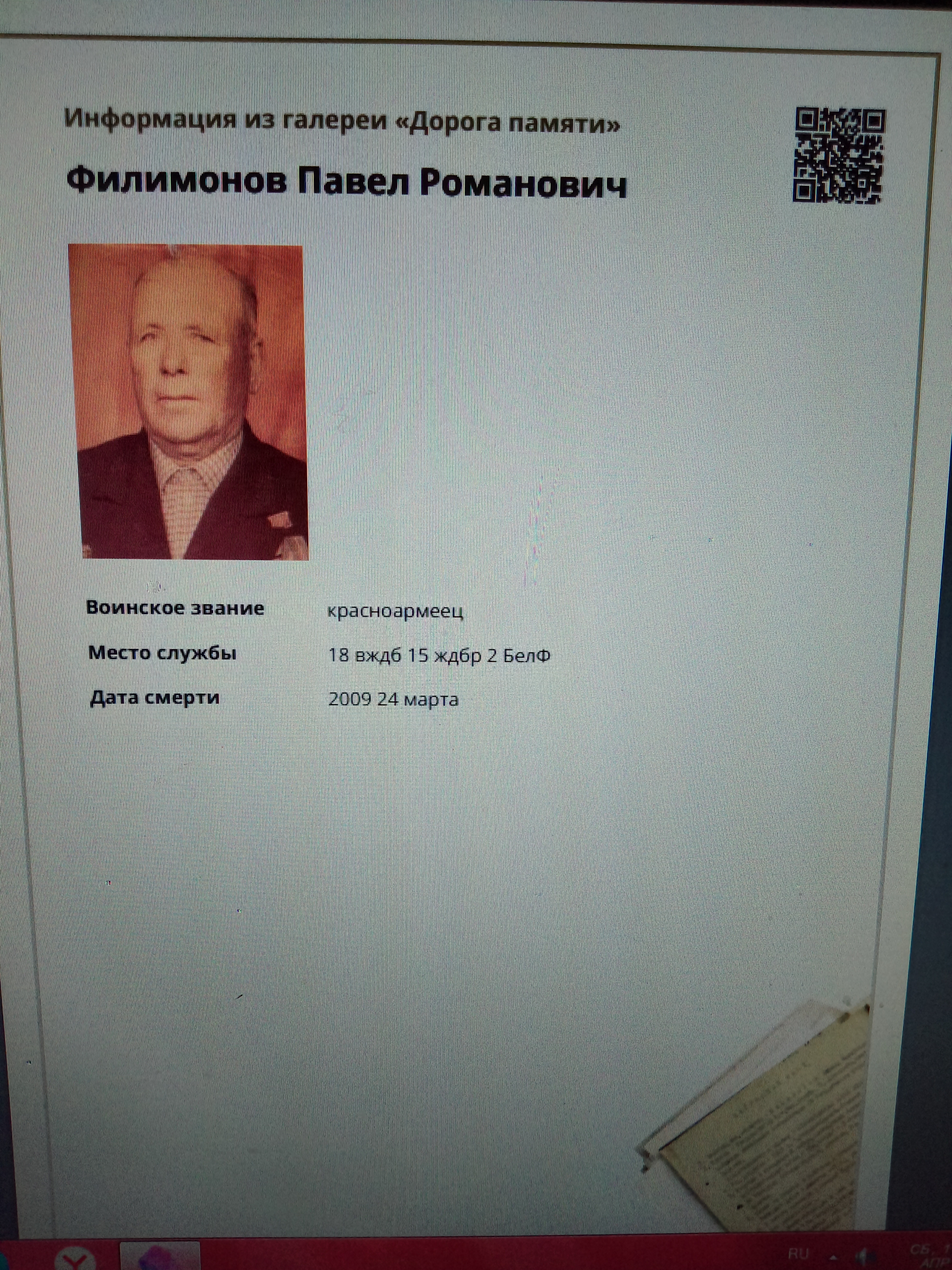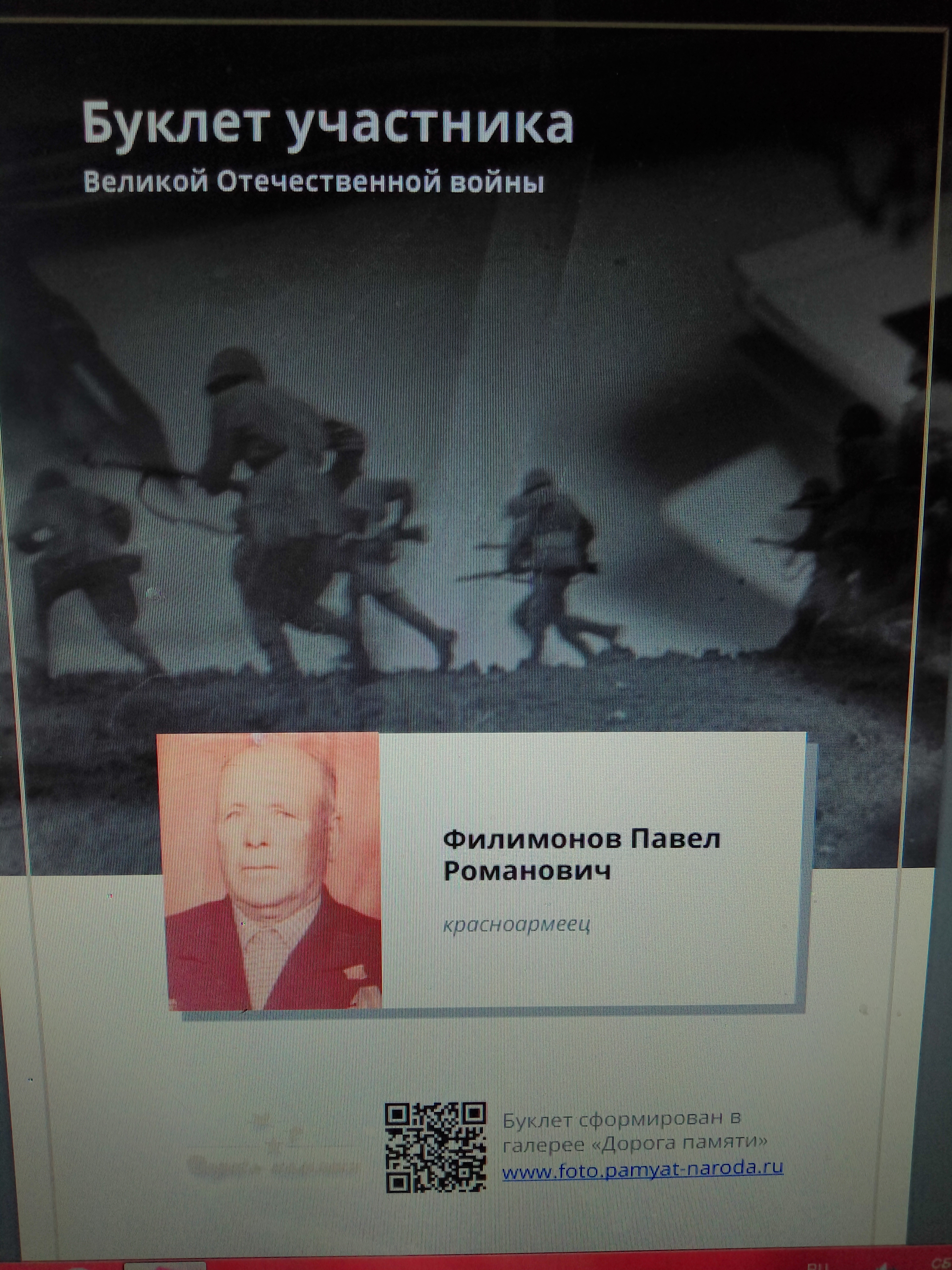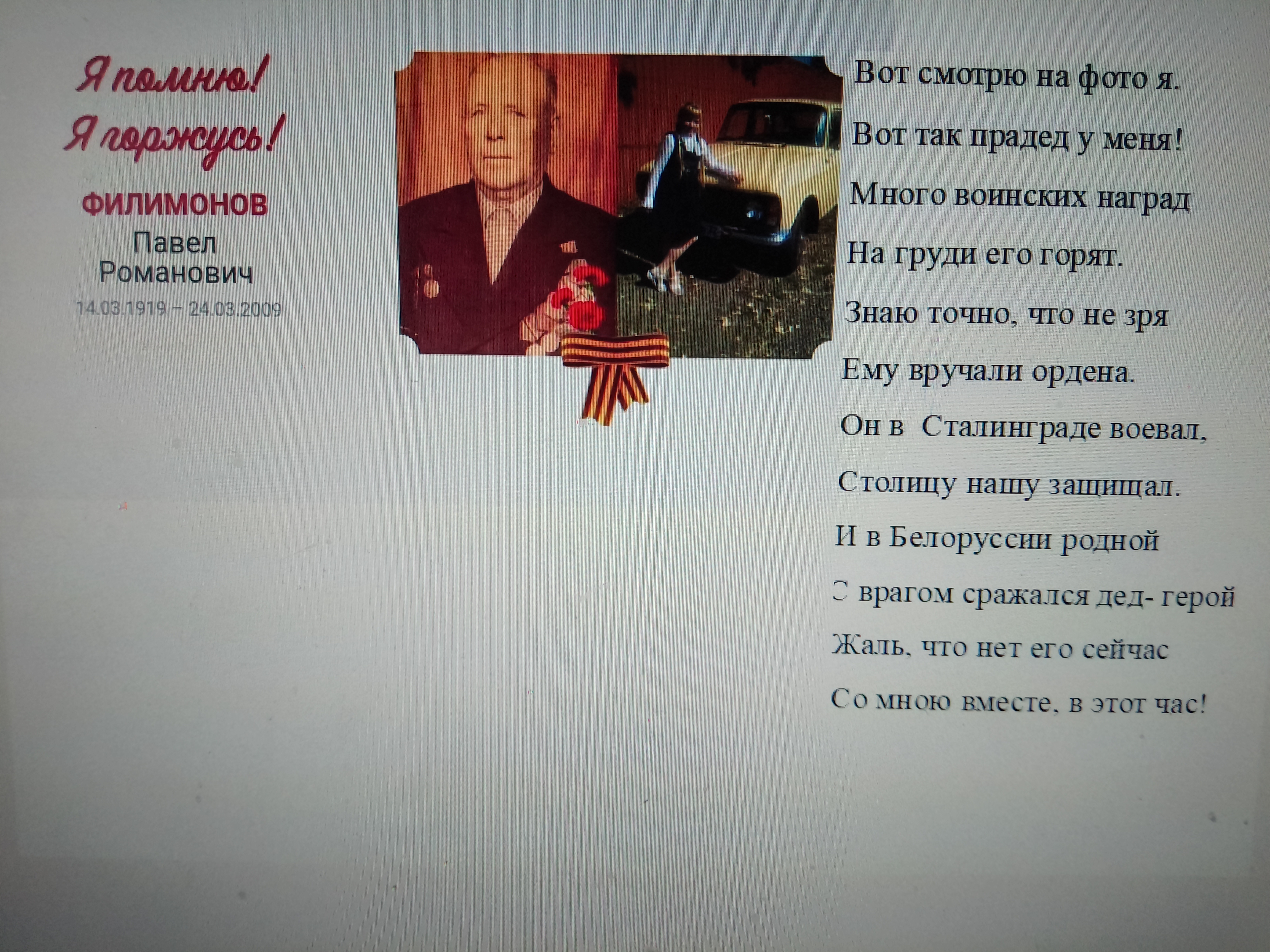 Мой прадедушка, Филимонов Павел Романович, родился 14 марта 1919 года в небольшой Белорусской деревне Теплое, Чаусского района, Могилевской области. Семья прадеда была большой: мать, отец, брат и две сестры. После окончания семилетки, он отправился на Донбасс, работал шахтером. Затем началась Великая Отечественная война и прадед отправился на фронт. Воевал в рядах второго Белорусского фронта, был на Калининском фронте, воевал в 18 железнодорожной бригаде, 15 железнодорожном батальоне. Был зенитчиком, командиром отделения. День Победы прадед встретил в Берлине. Здесь, у стен поверженного рейхстага, но увиделся со своим братом Леонидом, который пришёл к Победе своей солдатской дорогой. Участвовал в боях за Сталинград, Москву. Был награждён Орденом " Отечественной войны второй степени", медалями "За оборону Москвы", "За оборону Сталинграда", "За Победу над Германией", юбилейными медалями, а также медалью "За доблестный труд". После войны Павел Романович приехал в Брянск, где принимал участие в восстановлении разрушенного врагами города. Здесь он встретил мою прабабушку, свою единственную любовь. Они вырастили и воспитали двоих сыновей и дочь. Много внимания уделял патриотической работе, был частым гостем в школе #35 г. Брянска, участвовал на линейках и различных праздничных мероприятиях. 24 марта 2009 года прадедушка умер , похоронен в Брянске на Ковшовском кладбище. Информацию о его награждении я нашла в общедоступном банке данных «Память народа». Мы помним и гордимся им! 2018 году я стала победителем Всероссийского литературного конкурса «Герои Великой Победы-2018», в номинации «Проба пера» со стихотворением, которое посвятила своему прадедушке, Филимонову Павлу Романовичу… «Вот смотрю на фото я. Вот так прадед у меня! Много воинских наград На груди его горят. Знаю точно, что не зря Ему вручали ордена. Он в Сталинграде воевал, Столицу нашу защищал И в Белоруссии родной С врагом сражался дед - герой! Жаль, что нет его сейчас Со мною вместе, в этот час!»