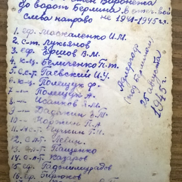 17 апреля 1941 г. призван в Красную Армию 26 апреля 1941 г. прибыли в г. Борисоглебск Воронежской области, побыли три дня в пехотной части, а потом перевели в зенитную часть 1758. 4 мая 1941 г. выехали из г. Борисоглебск в лагерь. 6 мая 1941 г. прибыли в местечко Крупки, Минской области. 22 июня 1941 г. воскресенье, утром после завтрака пошли на речку с политруком Крапивко купаться. Пришли по тревоге в 12 ч. дня, все собрались около трибуны комбриг выступил, что Германия напала на нас бомбили г. Киев, Ленинград, Севастополь и др. 22 июня 1941 г. выехали из лагерей. 27 июня 1941 г. на станции Орши бомбили, пять немецких самолета сбросили три бомбы на наш эшелон, шесть человек убито, две лошади. 28 июня 1941 г. ночью в два часа сбросили бомбы г. Смоленск на наш эшелон 2 июля 1941 г. прибыли в г. Борисоглебск 4 июля 1941 г. выехали из г. Борисоглебск 3 сентября 1941 г. 90 км. марш бросок прибыли на передний край под г. Смоленск. 26 сентября 1941 г. выехали с передовой 3 декабря 1941 г. прибыли в Трегуляево, Тамбовской области 26 мая 1942 г. прибыли в Скорняково, Воронежской области. 30 июля 1942 г. прибыли под Ливны 5 августа 1942 г. выехали в ст. Лотушкино, Орловской области 19 сентября 1942 г. прибыли в Верховье, Орловской области 19 января 1943 г. выехали в Готищево прорыв на Косторную, после чего стояли в Березовске-Алексеевке 12 февраля 1943 г. прибыли в русский брод Орловской области, Курская дуга. 25 июля 1943 года выехали на передний край хутора Алексеевка ст. Змеевки. 25 октября 1943 г. Воронеж-Глухов 8 октября 1943 г. в г. Новозыбков 6 декабря 1943 г. в г. Гомель 9 апреля 1944 г. выехали из г. Гомеля в Овруг через Днепр мозыр 11 апреля 1944 г. прибыли в г. Овруг 12 апреля 1944 г. выехали из Овруга под Ковель на ст. Новорск 15 апреля 1944 г. выехали из Владава в Медженец (Польша) 7 октября 1944 г. в Седлец (Польша) 16 января 1945 г. прибыли в г. Кутно 18 января 1945 г. прибыли в г. Отвоцк 30 км. от Варшавы 31 января 1945 г. прибыли в г. Гнизен (здесь сбит самолет "Мессер" 8 февраля 1945 г.) 6 февраля 1945 г. в г. Биримбаум (Германия) 14 апреля 1945 г. прибыли в г. Ландсберг 28 апреля 1945 г. прибыли в г. Штраусберг 30 км от г. Берлина 25 мая 1945 г. г. Берлин стояли на южной окраине около самолетостроительного завода (Адлергоф) В октябре выехали на север Германии на Датскую границу, оттуда домой. Он прошел долгий и славный путь от стен г. Воронежа до ворот г. Берлина.