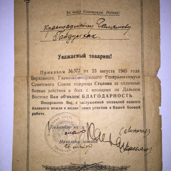 Имеет Благодарность от Сталина, приказ №372 от 23 августа 1945 года. Командир части: майор Лихачев.